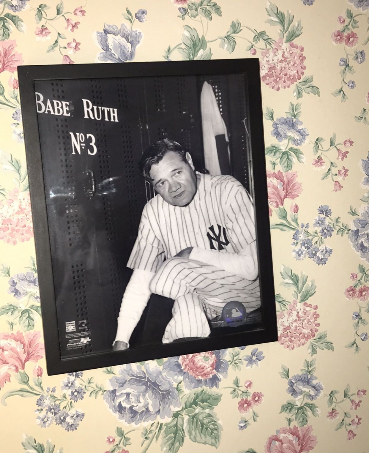 framed photograph from the official MLB Cooperstown Collection, black & white showing Babe Ruth after a game at Yankee Stadium- in the player locker room