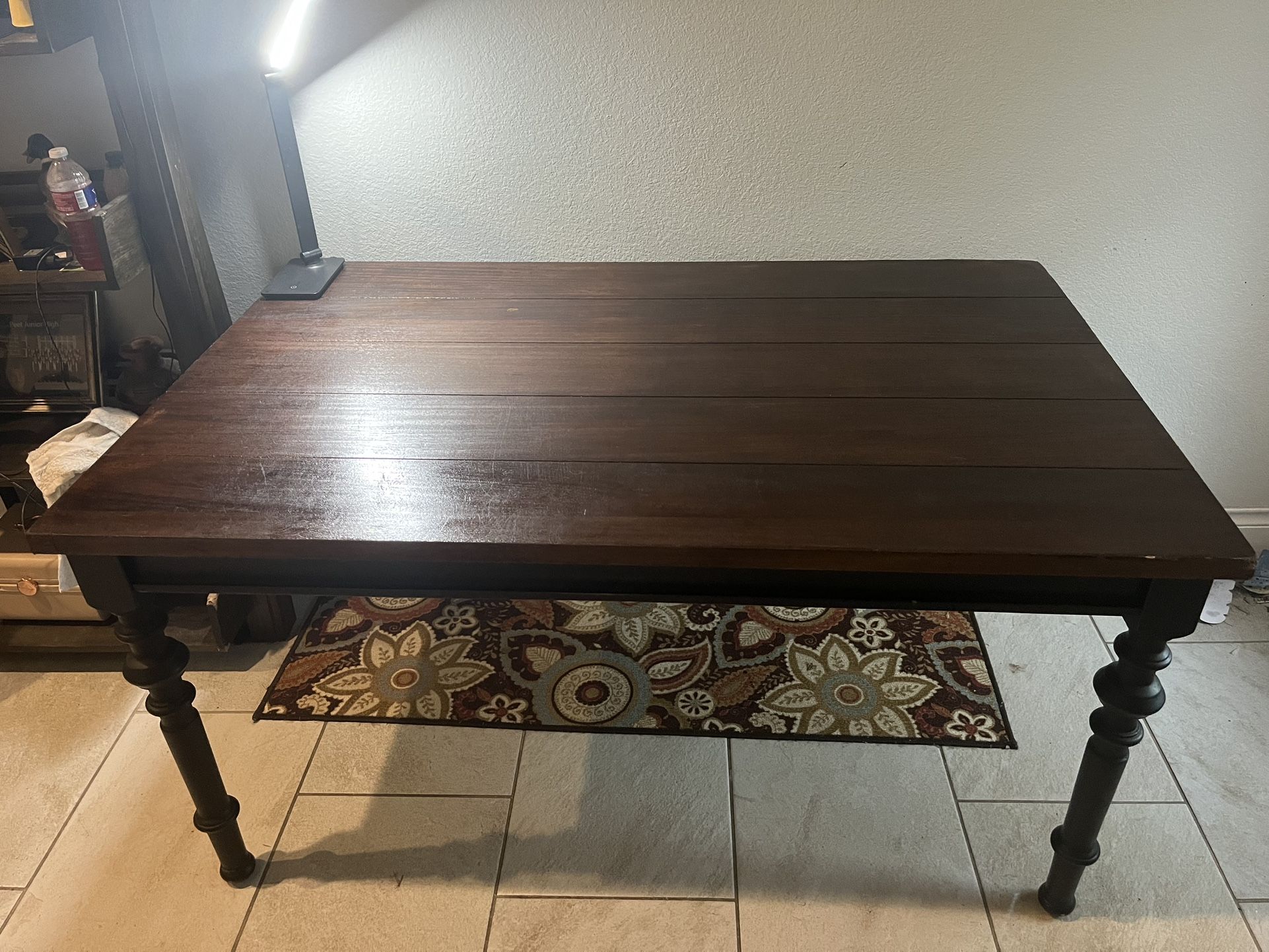 hardly used wood dinning room table. no chairs 4.9 ft by 3.2 ft