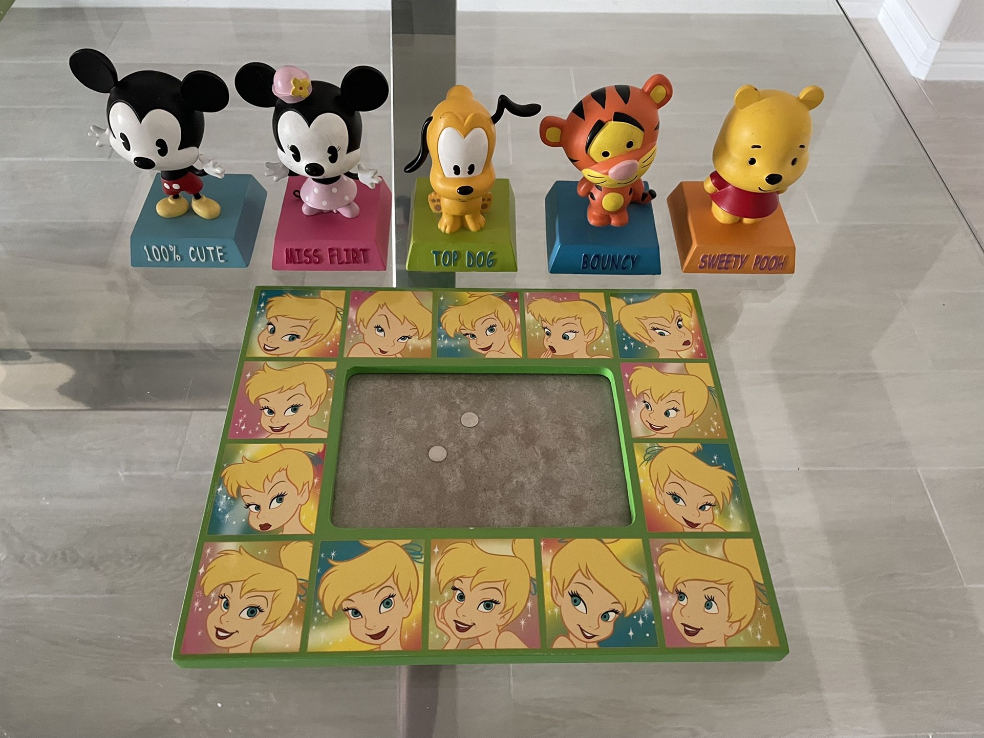 Cute Disney figurines of Mickey Mouse, Minnie Mouse, Pluto, Tigger, and Winnie the Pooh. *Pluto has a broken tail Picture frame of Tinkerbell - Great Condition Great for decoration!!