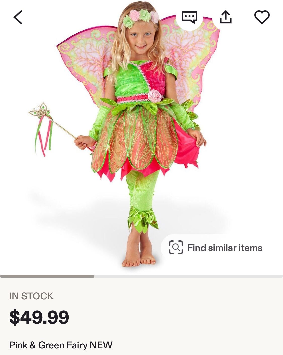 fanciful fairy costume A celebration flowers taking flight: fanciful fairy costume in shades of pink and leaf green with multi-layer leaf skirt and lots of components. Multi-layer dress with leaf peplum overlay and rosette bodice trim Leaf-green velvet leggings For ages 3 yrs + Designed for child sizes 3-8 Easy to put on and easy to wear Polyester and/or nylon fabrics; plastic accessories Meets all applicable toy safety regulations and standards