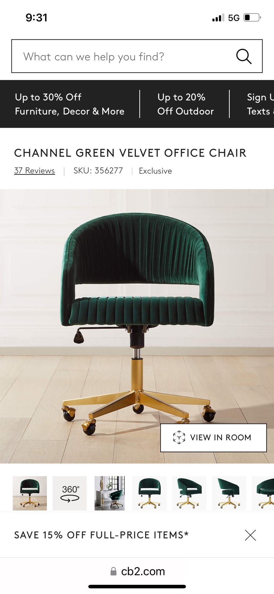 Green velvet office chair from CB2. This chair is discontinued from CB2. This chair is brand new. After opening and realizing the arms hit my desk, I put it aside to return but never did. It’s still in the box.