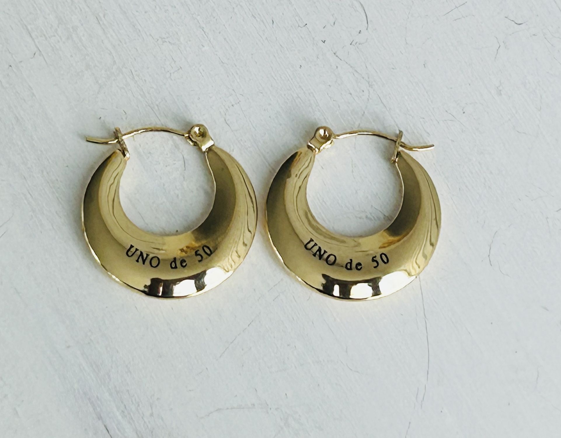 I'm selling beautiful wide hoop earrings in a gold color. They have a very trendy design with decorative engraving on the front. • Material: Costume jewelry / Alloy (Not real silver or gold). • Style: Chunky / Boho, very similar to the style of well-known brands. • Condition: New / Good condition. • Note: These are fashion jewelry (imitation), ideal for completing an everyday look without spending a lot. They look very striking when worn.