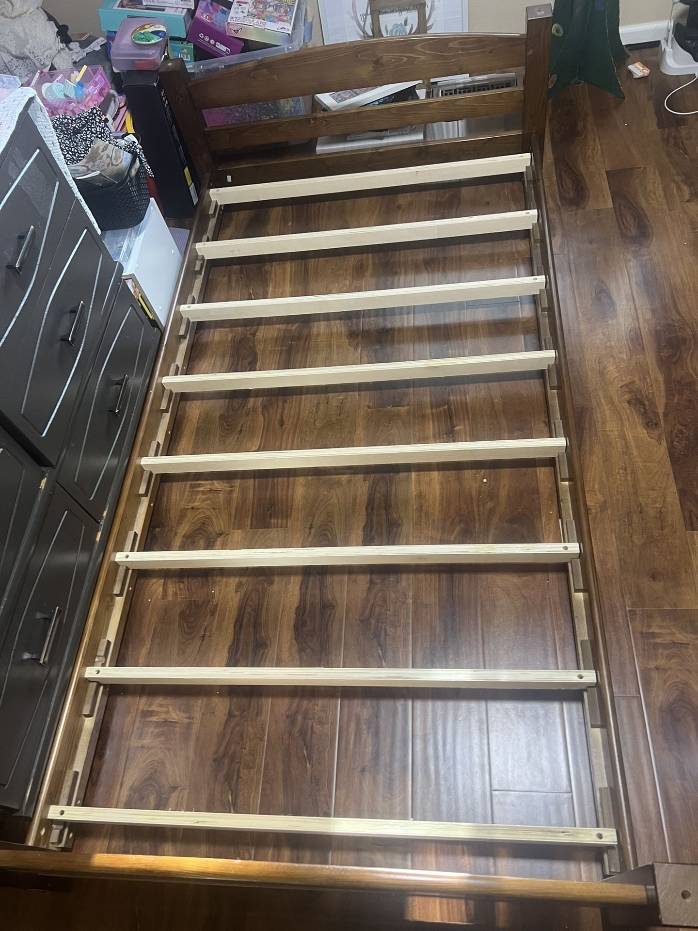 Wood twin size bed frame that is low to the ground and perfect for toddlers and young children. The mattress is memory foam and has only been used a few times. No stains, great condition, we just don’t have any need for the second bed (this was part of a bunk bed set). Bed frame has been deconstructed for easy transport.