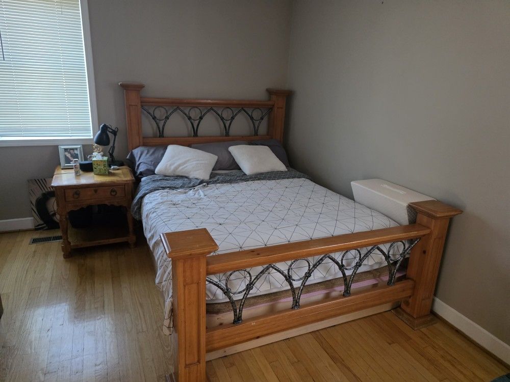 Selling a sturdy wooden bed frame featuring unique metal accents. It's in good condition and ready to add a touch of rustic charm to your bedroom