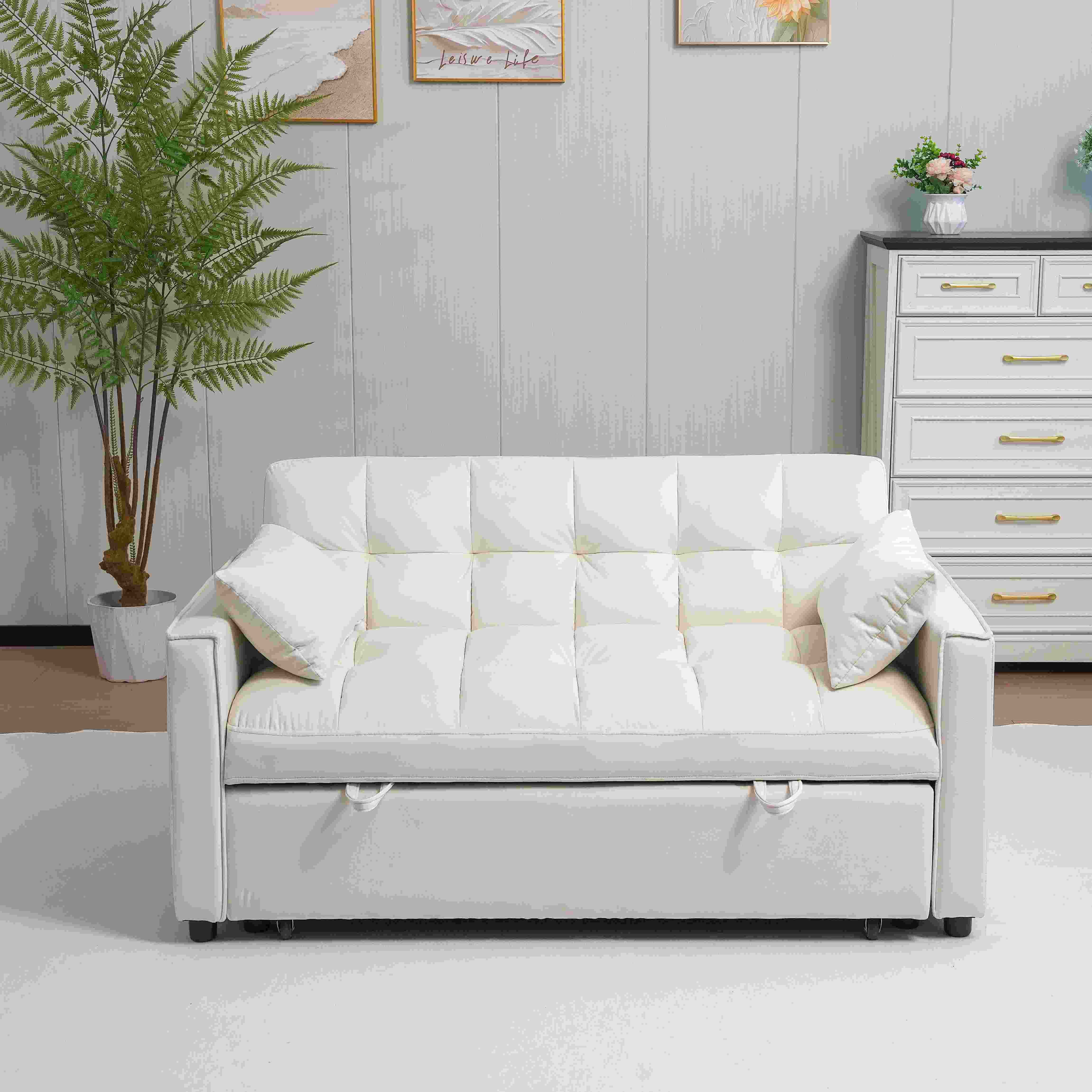 Sleeper Sofa Bed, 3-in-1 Velvet Pull Out Couch with Armrests, Storage Pockets and 2 Pillows, Adjustable Backrest, Sofa Bed Couch for Living Room, Bedroom Variable bed Length (in.): 48.23 Width (in.): 38.19 Height (in.): 15.94 Weight (lbs.): 130.10 Discover unparalleled flexibility with our 3-in-1 velvet sleeper sofa, ingeniously designed to adjust to your lifestyle. Whether you're lounging at a 105° angle, reclining at 138°, or sleeping soundly at 180°, this pull-out loveseat sleeper offers the perfect posture for every moment. Its adjustable backrest ensures you experience tailored comfort at every turn. Our Futon Sofa Bed is the epitome of convenience, featuring dual hand straps for a smooth transition from a sofa to a chaise lounge or a sofa cama. This piece is ideal for those who love to entertain, providing a cozy spot for movie nights, gaming sessions, or comfortable lodging for overnight guests with just a simple tug. Crafted with a robust wood frame and draped in luxurious velvet fabric, this pull out couch high-density sponge filling offers an elastic yet supportive seating experience. Accompanied by two soft lumbar pillows, it invites you to unwind and indulge in restorative rest, all while supporting up to 600lbs with ease. Maximize your space with built-in storage pockets and dual armrests that deliver both form and function. Keep your essentials neatly organized and close at hand, whether you're settling in for a gaming marathon or simply enjoying your favorite book. It's the smart way to maintain a tidy and inviting living area. Ease of assembly is guaranteed with clear instructions and all necessary hardware included. Our commitment to your satisfaction extends beyond the purchase with dependable after-sales service, making this convertible sleeper sofa a wise investment for those who value comfort, convenience, and peace of mind. W3138P281697 CA10