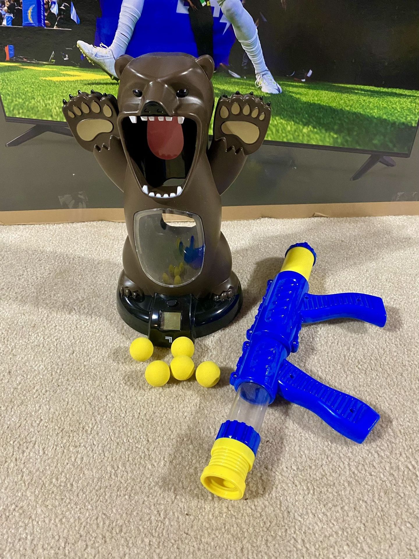Test your marksmanship with the ultimate game to cure boredom! The hungry bear target game includes a set of foam balls with a launcher. Hit the balls against the bears tongue to score points. Points are tracked with the LCD score tracker. Set includes 1 bear, 1 blaster, 5 foam balls. Batteries for bear digital counter are not included. Recommended for ages 5 to 7 years old. Note - this is a used set that is functioning fully as intended. Buyer understands that regular wear and tear is present.