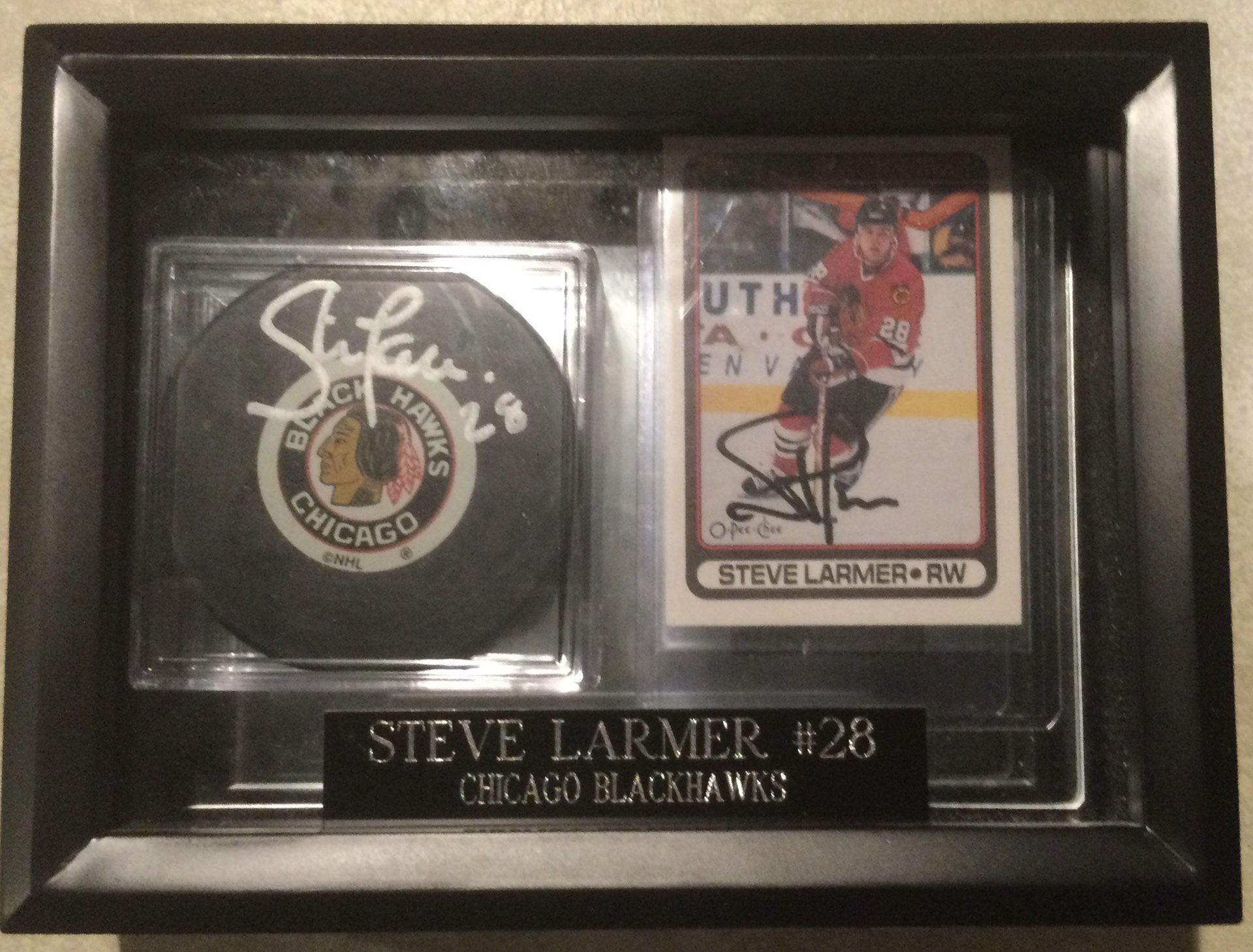 Steve Larmer Autographed Puck And Card In Case