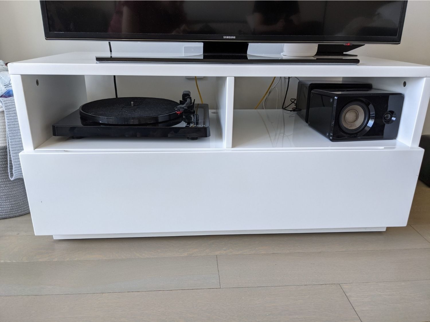 CB2 Chill 40" White High-Gloss Media Console/ TV STAND table Chill White Media Console. 40"Wx20"Dx19.25"H CB2 doesn't sell this exact model anymore but does still have larger models in the collection. Condition: Used - Excellent/Good Overall Dimensions: Width: 40 inches, Height: 19.5 inches, Depth: 20 inches Environment: Pet free home • Smoke free home Category: Media Storage Material: Lacquer Color: White Thoughtful details and workmanship by Eric Pfeiffer at an exceptionally thoughtful CB2 price. Smart details you can't see here: back is completely finished —all white, all around —so it can float in the room; center media cutouts funnel cords to an integrated ledge along the entire lower back edge then out the bottom to tidy up wires. Engineered wood slicked in hi-gloss lacquer. chill media console is a CB2 exclusive. Chill White Media Console. 40"Wx20"Dx19.25"H Designed by Eric Pfeiffer Low-emission engineered wood with hi-gloss white lacquer Plinth base One drawer with metal glides Cord cutouts.