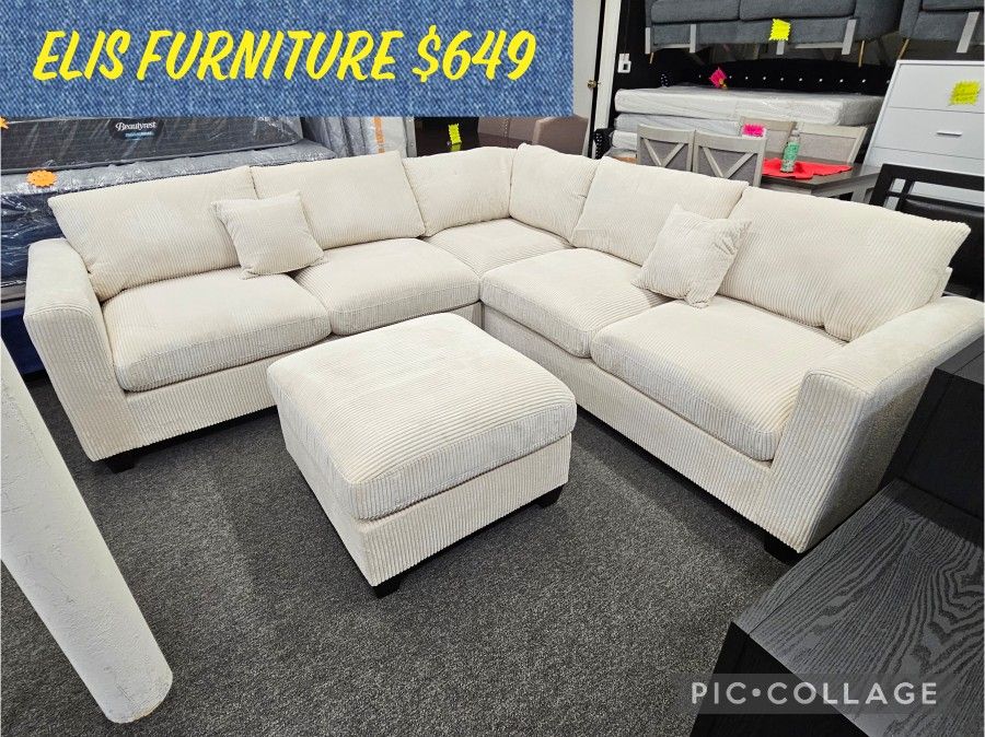 Brand New Sectional Corduroy Fabric 4 Pcs Ottoman Included Beige 99 × 99 $649 + Tax ELIS FURNITURE FINANCING AVAILABLE 3 MONTHS SAME AS CASH FREE LOCAL DELIVERY EVERYDAY 11 TO 7 PM