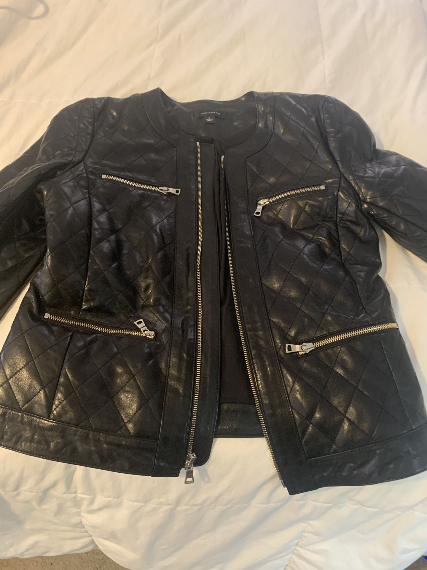 Black leather textured Ann Taylor jacket , Gold Zippers . Very classy and elegant. Could dress it up or down. Great jacket