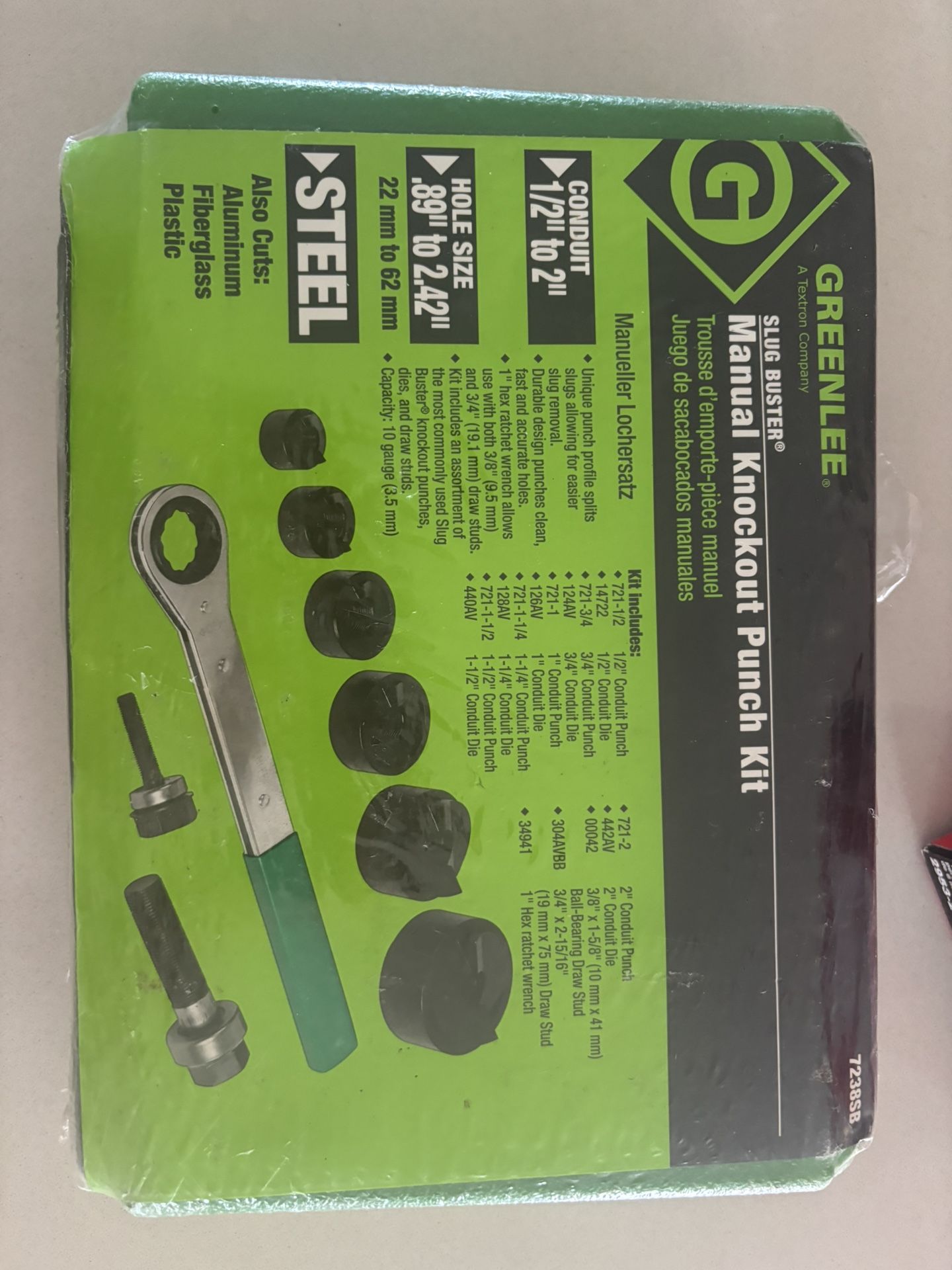 1/2" - 2" SLUG-BUSTER KNOCKOUT KIT: Punches precise holes in up to 10-gauge mild steel, aluminum, brass, copper, fiberglass, and plastics with an outside diameter of 7/8" for 1/2" to 2" conduit size knockouts HIGH-LEVERAGE RATCHET WRENCH: Built to meet the needs of busy electricians on the jobsite, the high-leverage 1" hex ratchet wrench features a convenient 5-degree ratcheting mechanism ERGONOMIC PUNCH PROFILE: Effortlessly splits slugs in half to make the slug removal process extremely easy and has a knurled edge for a secure grip EASY THREADING: Punch tool conveniently eliminates cross-threading by drawing studs with the dog point tip to make threading simple INCLUDED CARRYING CASE: Kit includes a KRW-1 high-leverage ratchet wrench, 1/2" to 2" conduit size Slug-Buster punches, 1/2" to 2" conduit size dies, 7/16" and 3/4" ball-bearing draw studs, and a KCC-RW2 rugged carrying case