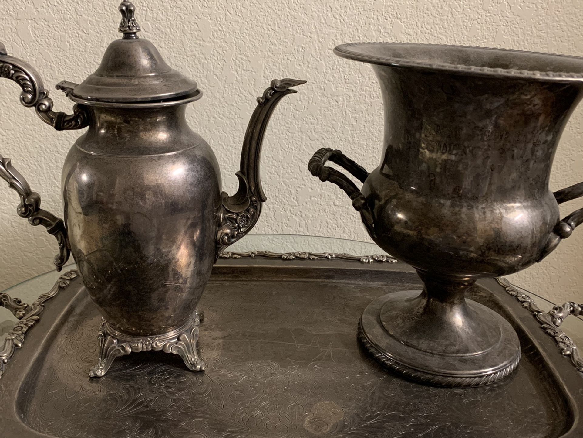 Beautiful antique silver tray, teapot and Roman style trophy cup. Very clean.
