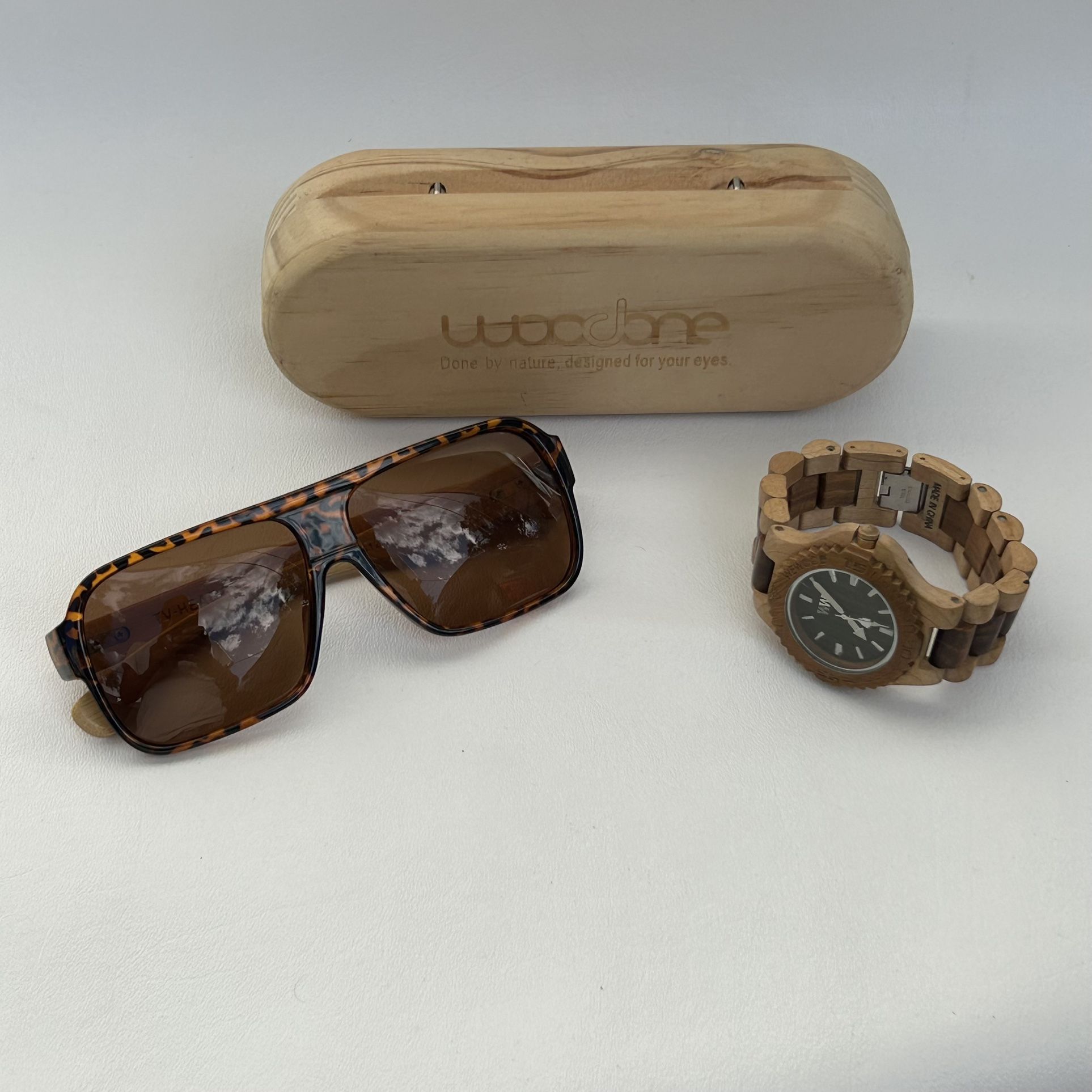 Wewood watch & wood Sunglasses bundle. Wewood watch, E13-148 100% natural wood, stainless clasp. TV Head Co. Wood look Sunglasses. Both gently used and in great condition. Watch will need a battery. For yourself or for a gift. Great deal at $30. Downtown area for pick up. Address when you’re ready. Thank you.