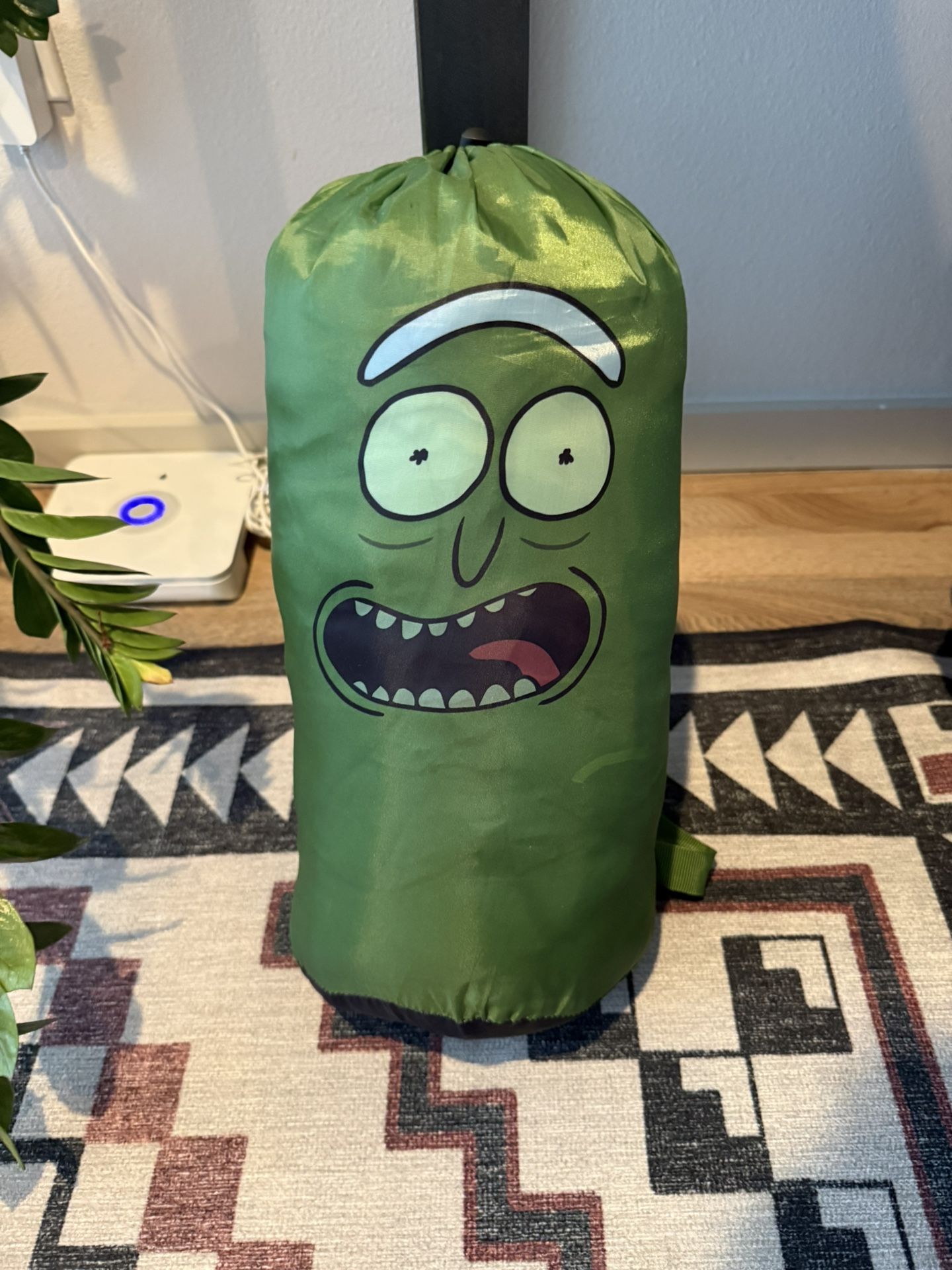 Unused, still has tag. From ThinkGeek: This mummy-style Pickle Rick sleeping bag is lightweight and compact for easy transport and comes in its very own pickle green case sporting Rick’s iconic mug. $15 cash obo Pickup Ballard or Pioneer Square