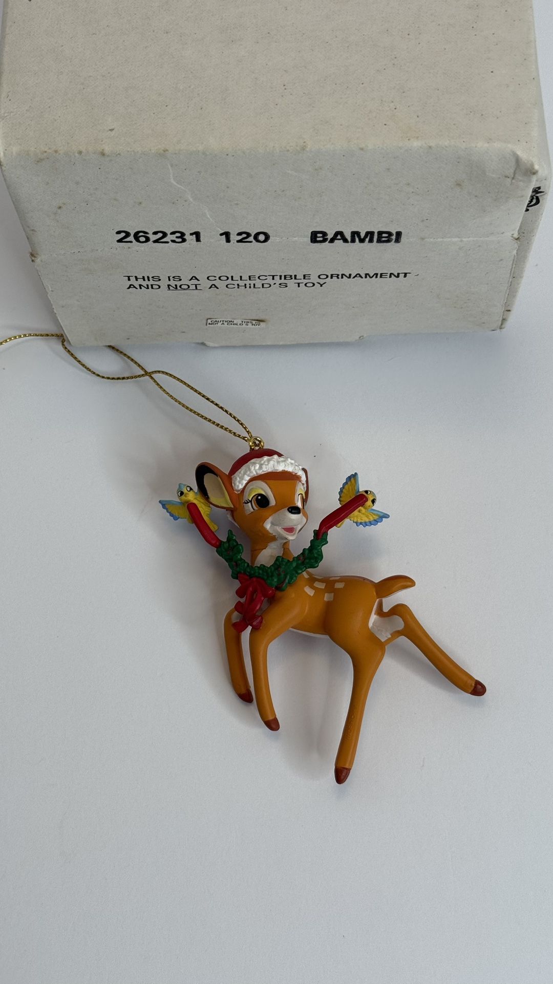 Bring a touch of classic Disney magic to your Christmas tree with this vintage Bambi ornament. Bambi is wearing a Santa hat and a festive wreath around his neck, with two colorful birds perched on his antlers — a bright and charming collectible. Item Details: • Character: Bambi • Brand: Disney • Type: Collectible Christmas Ornament • Material: Resin / Hard plastic • Includes: Original box • Item Number: 26231 120 • Made in China • Size: approx. 4.5–5 inches tall • Lightweight design – easy to hang Condition: • Ornament in excellent vintage condition • Bright colors, no cracks • Very minimal wear from age (see photos) • Box shows heavy storage wear (stains, spots, dents) Features: • Santa hat with white trim • Green Christmas wreath with red bow • Two detailed birds on antlers • Gold hanging string included Perfect For: • Disney collectors • Bambi fans • Christmas tree decoration • Holiday gift • Vintage décor lovers