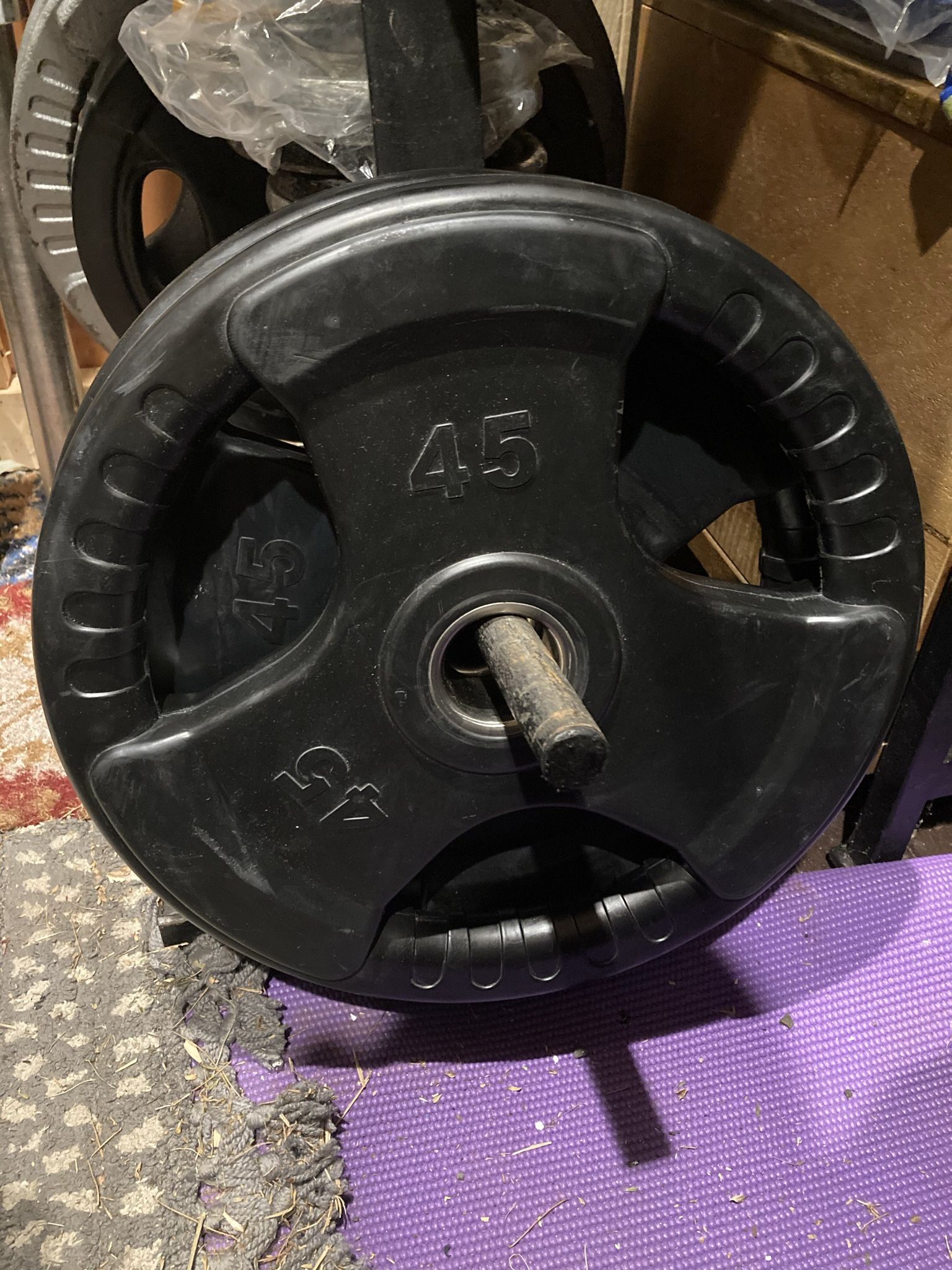 2 x 45 lb rubber wrapped steel Olympic weight plates. New condition. I have many other sizes available in steel, rubber and urethane depending on your needs. Let me know.