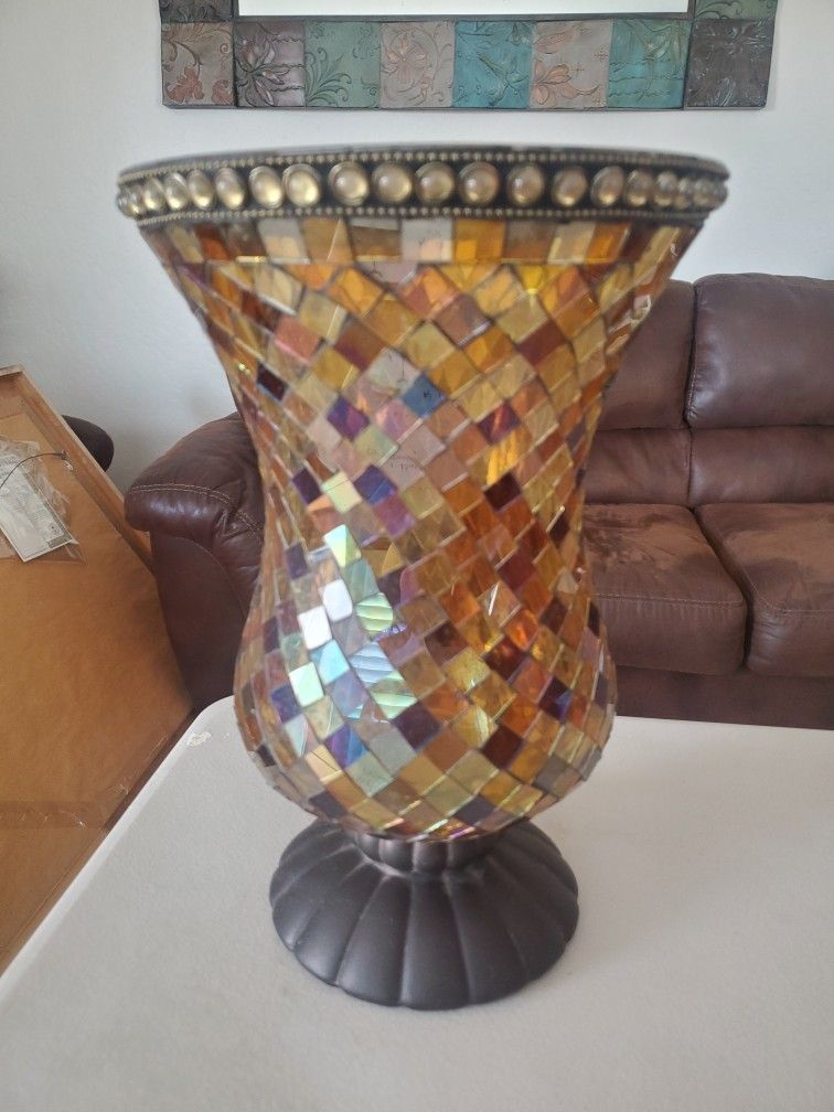Party Lite stained glass mosaic candle holder. Has gold beaded top rim and solid dark brown base No chips or cracks 12"h x 7"w 6"w in middle 8"w top opening I take Cash, Zelle, Venmo Area of 113th ave and durango. Avondale, Az. 85323