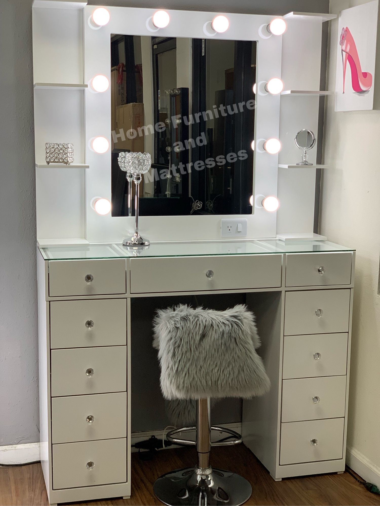 Vanity dresser with 11 drawers, crystal knobs glass top, both shelves on top and white frame mirror. Available white, silver or black🤍🩶🖤 Payment plan 3 months payoff no fees No interest, No credit needed $0 down Layaway Birthday Girl or XV años💖 Delivery and assembly available🚚 Hablo español👍Tocador de maquillaje con espejo de luces nuevo.