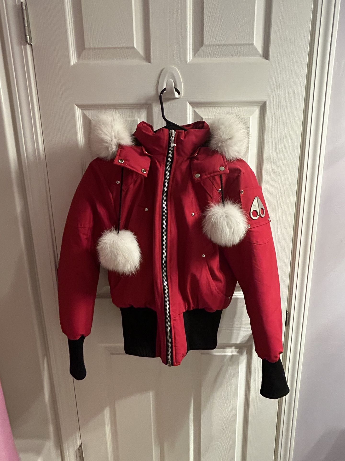 Rarely worn size LARGE , runs like a medium. Bright red Mooseknuckle Women’s Large runs like a medium puffer coat, with white fur. Great a condition, non smoker home.