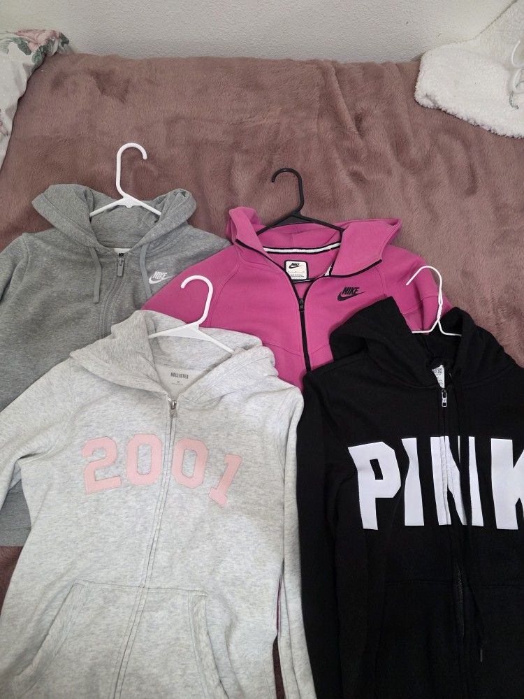 Grey Nike small,black pink medium, pink Nike small,Grey Hollister medium. Good condition ,no rips or tears$65 for all