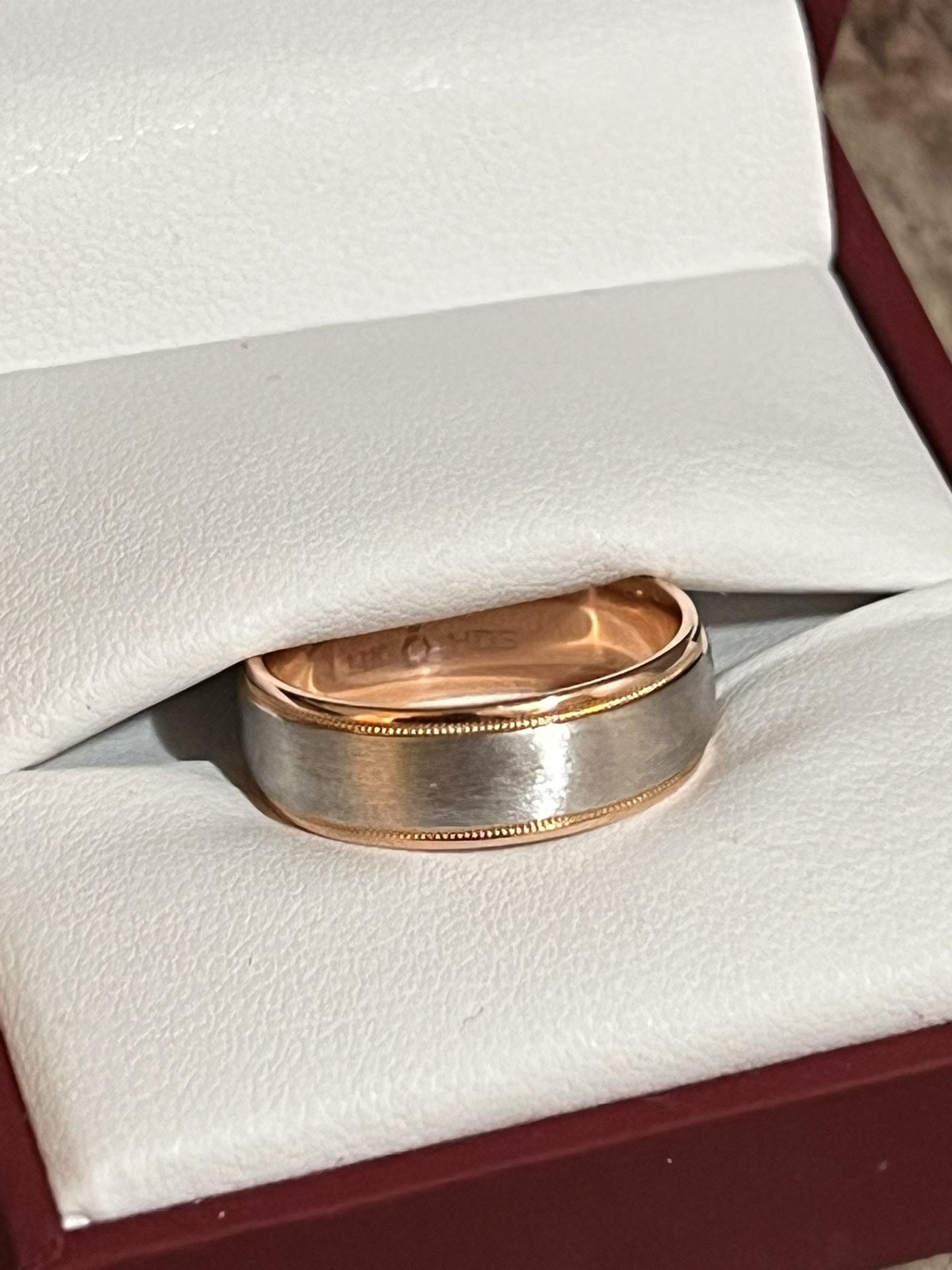 This is a Men’s ring, Size 9 I have the original receipt for the item as well. It is a 14KT white gold with rose gold Bought it as a ring to wear, recently got married and no longer wearing this ring