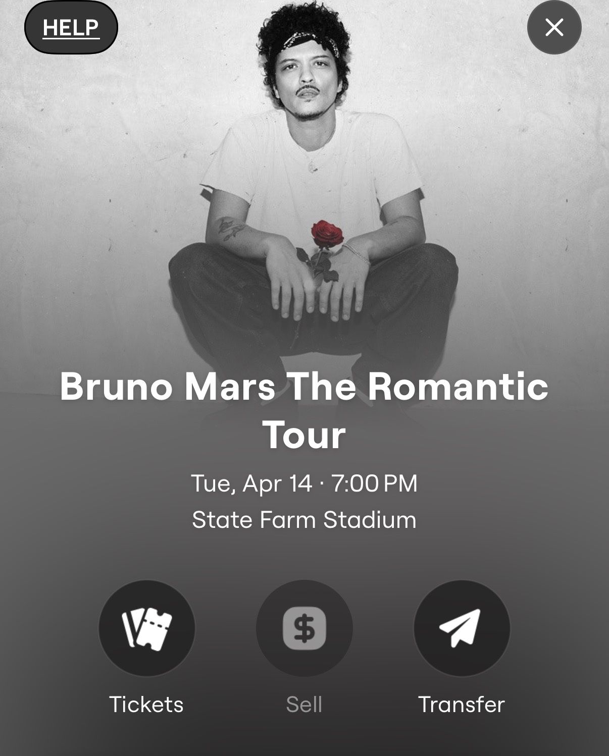 I have two Bruno Mars floor seat tickets located at section E row nine seats 5-6 I am unable to go and selling for what I paid for In order to affect the transfer tickets, I will need your phone number and email I can either meet you or FaceTime to complete the sale Method of payment is zelle or venmo **** $1,400 Ticket prices is for both tickets **** Bruno Mars – The Romantic Tour – April 14, 2026 – State Farm Stadium Glendale AZ Tickets Quantity: 2 Section: E (floor seats) Row: 9 Seats: 5-6 Delivery & Transfer: Tickets will be delivered via Seat Geek Mobile Transfer within 24 hours of confirmed payment. Transfer will be sent via phone or email After transfer, I will provide a Seat Geek confirmation screenshot as proof of delivery. Important Notes: These are mobile tickets only. No PDFs or barcodes are available. They will appear in your Seat Geek account and Apple Wallet after transfer. Buy with confidence – check my feedback. These tickets are genuine and will be transferred securely via Seat Geek
