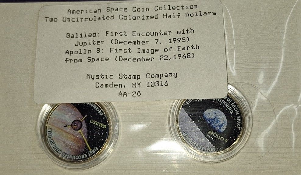 American Space Coin Collection featuring two colorized, uncirculated United States half dollars. One coin commemorates the Galileo mission's encounter with Jupiter in 1995. The other coin commemorates the Apollo 8 mission, which captured the first image of Earth from space in 1968.