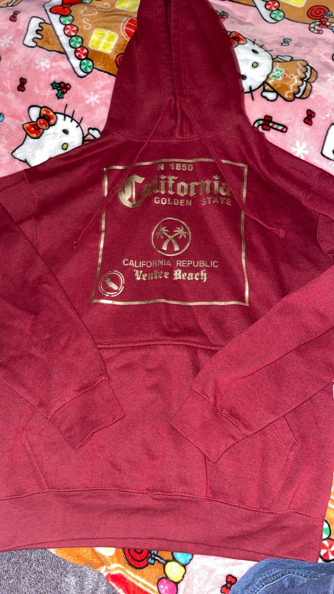This is a maroon California Golden State 1850 hooded sweatshirt with a gold-colored graphic