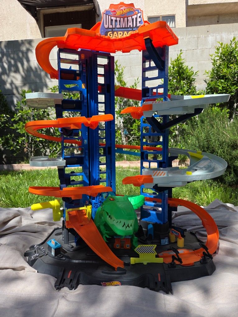 Hot Wheels City Ultimate Garage from Mattel. This three-foot tall playset holds 100 cars. Features a T-Rex, car wash and racing lanes.