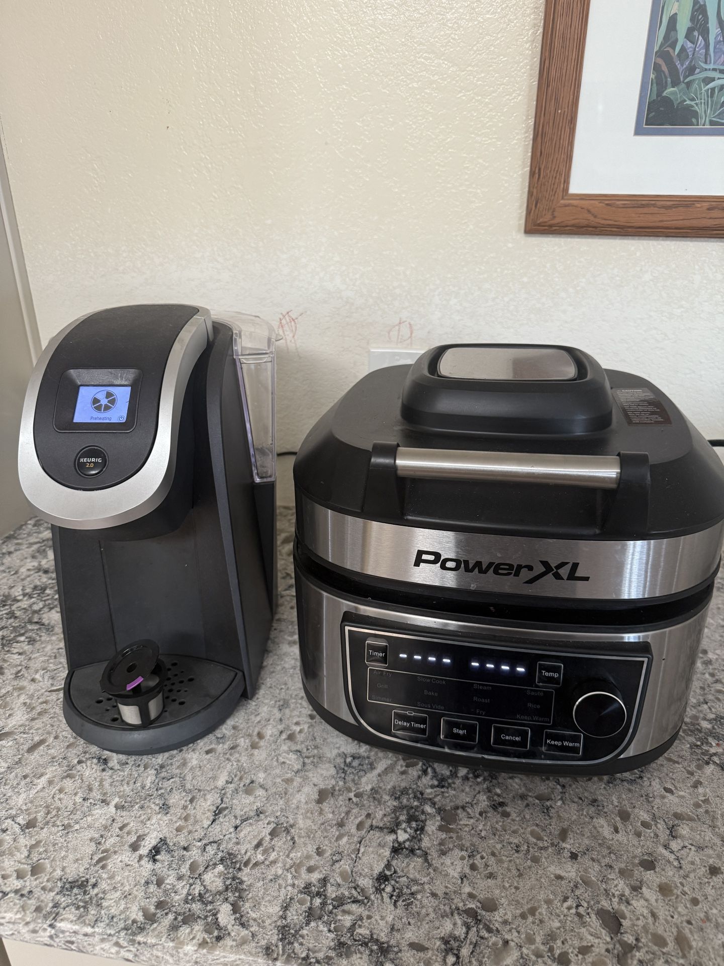 Keurig 2.0 coffee maker - $40 - removable water reservoir and removable drip tray - (1) reusable k-pod included - touch screen with programmable features Power XL grill airfryer - $60 - tempered glass lid, nonstick pot + grill plate included - 12 cooking settings: air fry, bake, fry, indoor grill, sous vide, saute, simmer, steam, rice, slow cook, roast, keep warm