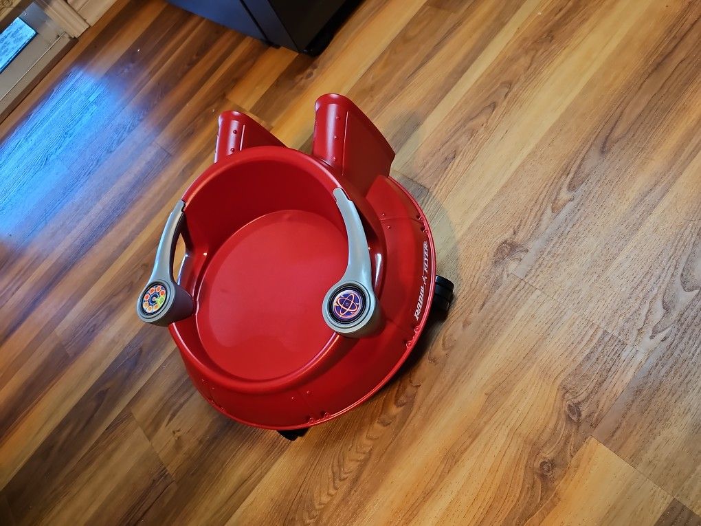 Like new. Get ready for some out-of-this-world fun with the Spin ‘N Saucer from Radio Flyer! Equipped with EZ-Glide wheels for 360° movement, children are free to create their own motion and can move in any direction - there is no getting stuck! The SafeSpin design offers a low-profile for stability, and the ergonomic handle gives your child the leverage they need to spin freely.