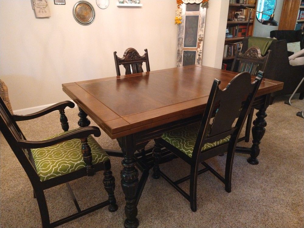Vintage dinning table Closed- 60 inches. Open-96 inches 40 inches wide. Has been refinished with distressed finish on lower portion and chair Solid table all real wood.