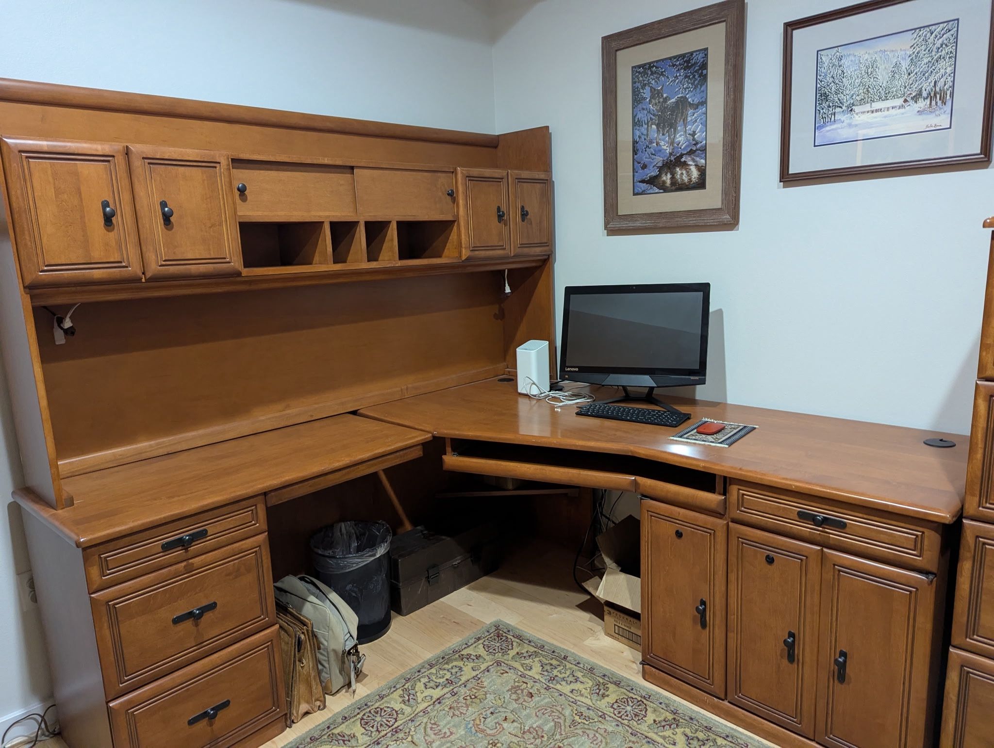 4- drawer matching file cabinet optional. Both the desk and file cabinet are good quality wood with a nice cherry finish. This desk has served up well for 35+ years and is in excellent condition. We are downsizing and can't take it with us.