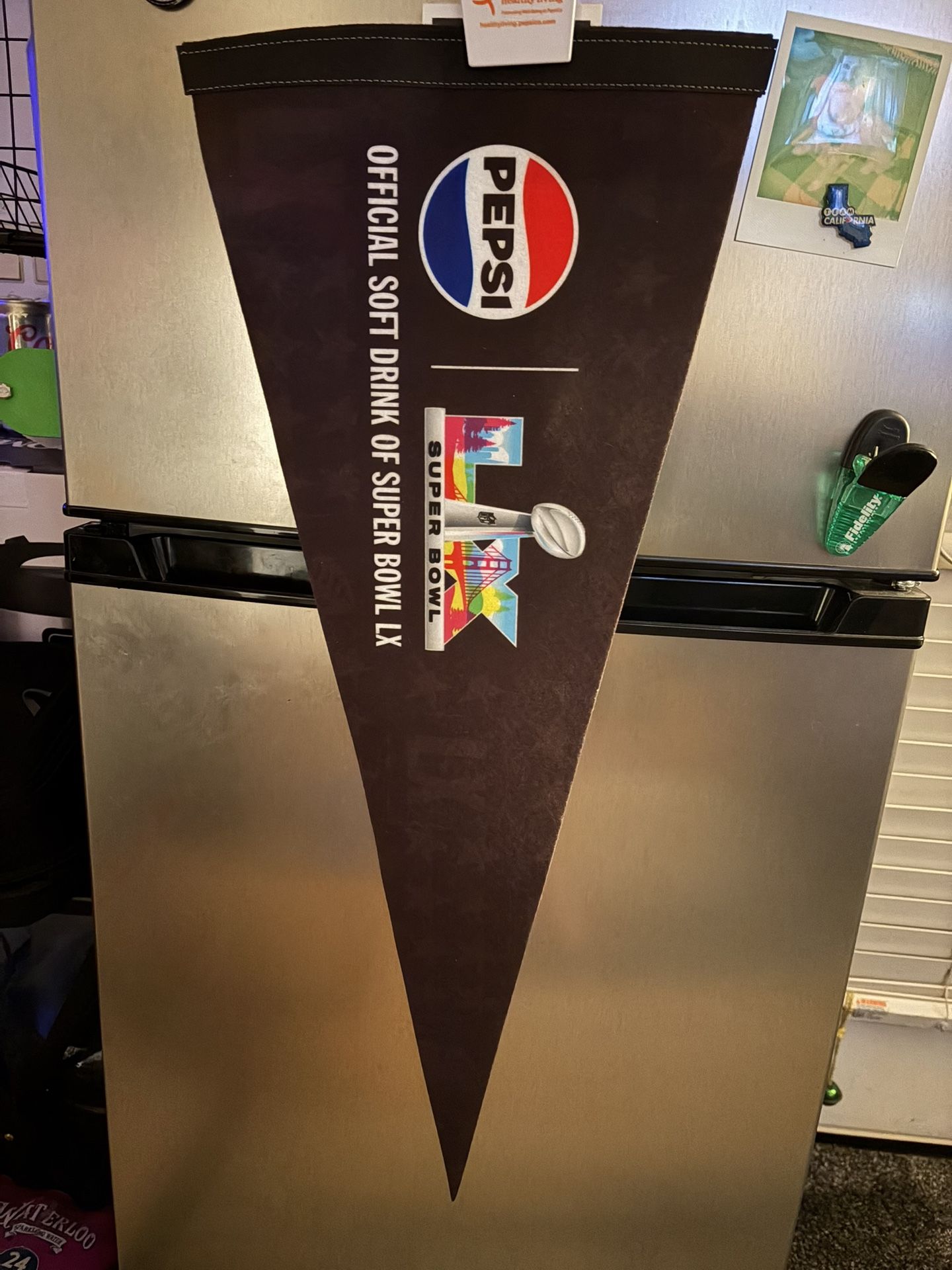 Pepsi sponsored big game pennant. Super Bowl 60. NFL football San Francisco New England Patriots Seattle Seahawks Forty Niners