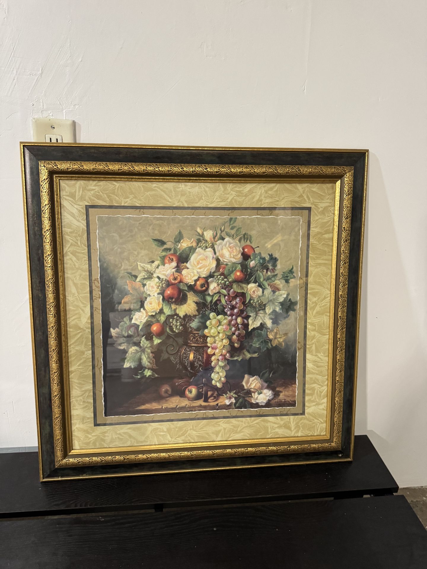 Price: $30 Description: Large framed still-life wall art featuring flowers, grapes, and fruit in a decorative vase. • Made for Home Interiors and Gifts • Ornate gold and dark wood frame • Ready to hang • Good condition Size: • 29 inches x 29 inches