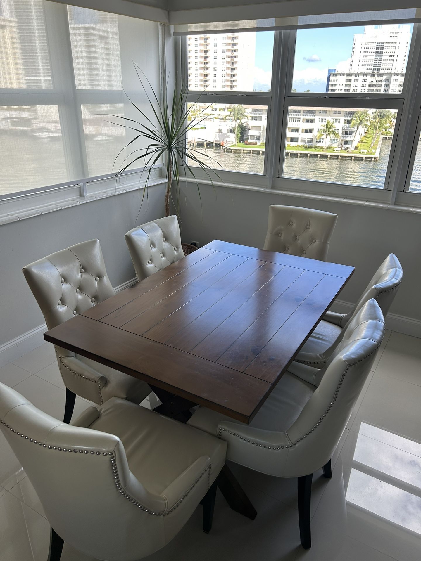 Wooden table Dimensions in inches 54x35.5 White leather chairs x 6 In very good conditions