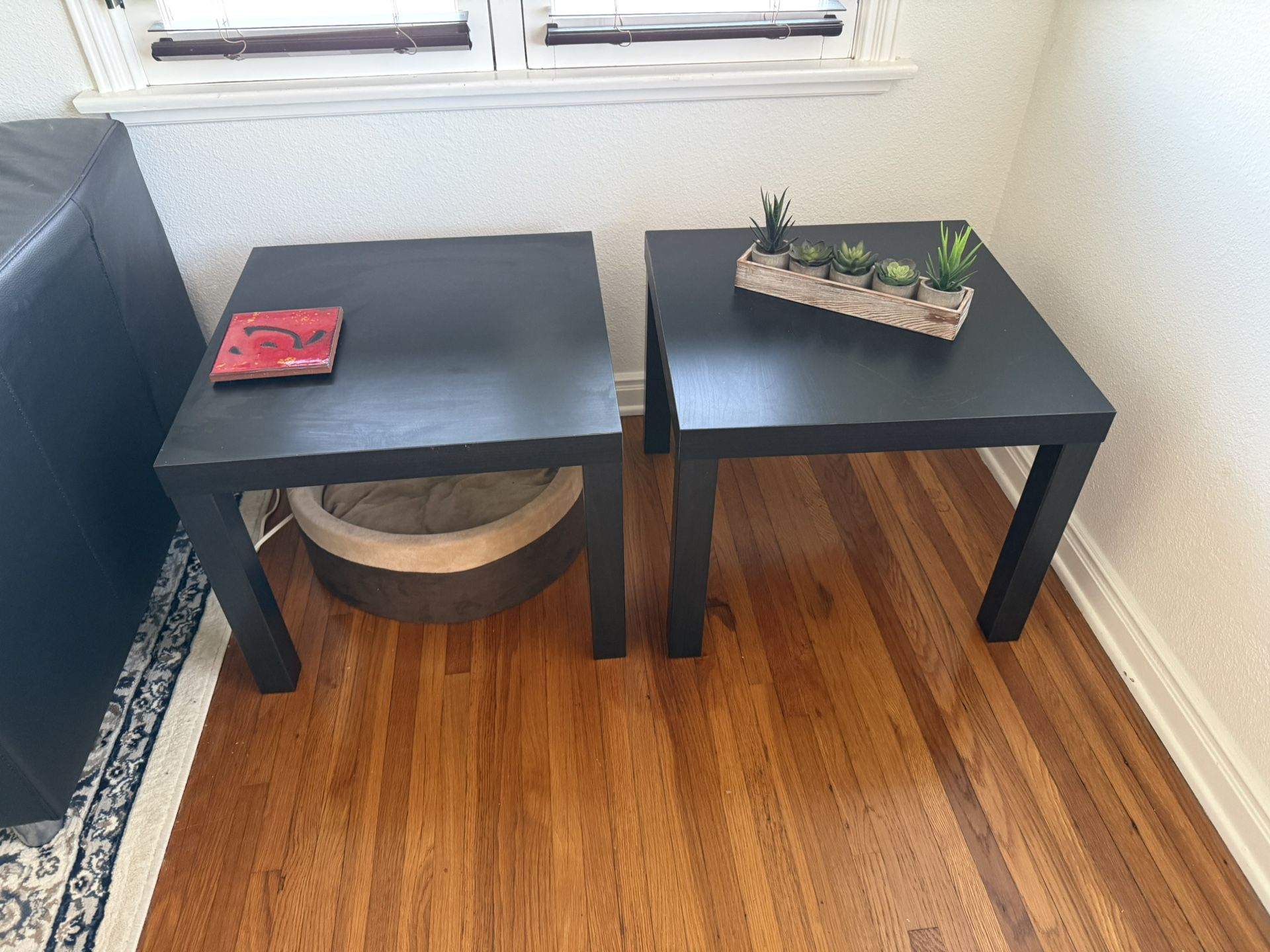 Black side tables. One is missing black strip but you can’t tell when pushed against a wall.