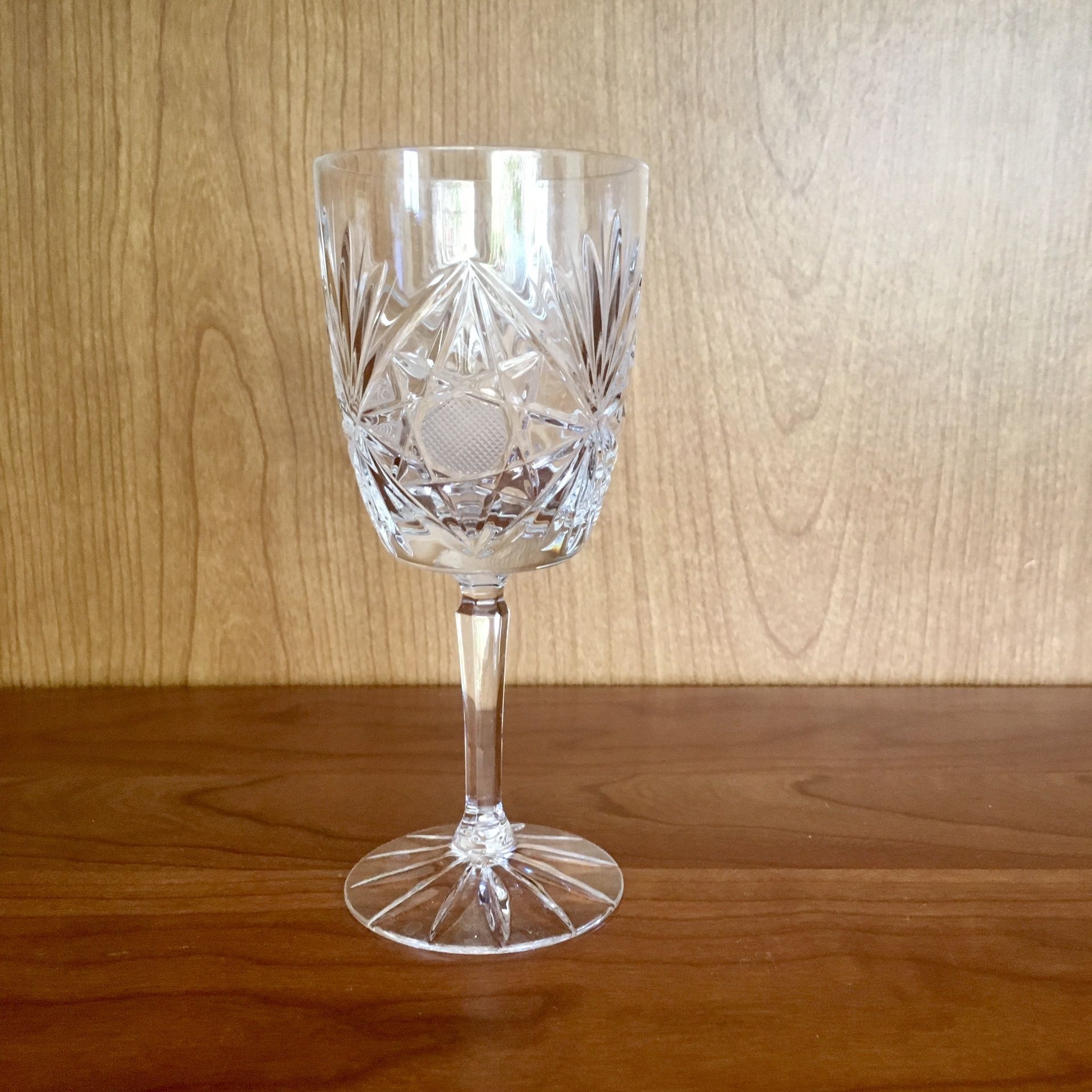 Vintage / Antique American brilliant cut clear glass. Not sure of age, but my estimate is around 1920s - 1930s. White glassware stemware goblet cup. I believe this is made from crystal glass. High quality and unique piece. Pentagram star detail. In excellent condition. Single glass.