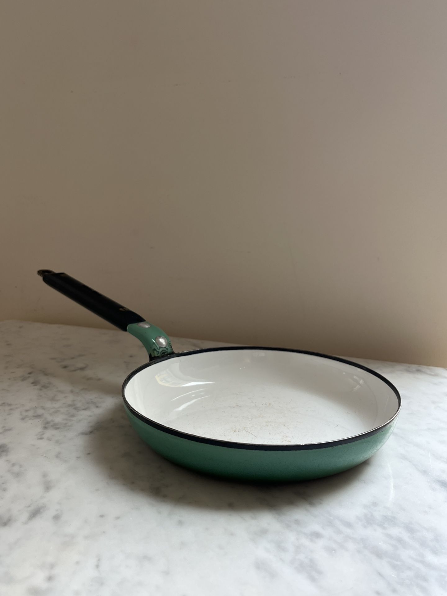 Vintage Globe-Ware Green Enamel Skillet Pan 8” Brand: Globe-Ware Condition: Used Dimensions: 7-7/8" Diameter x 1 1/4" Depth x 16" Length Weight: 1 lb 13 oz