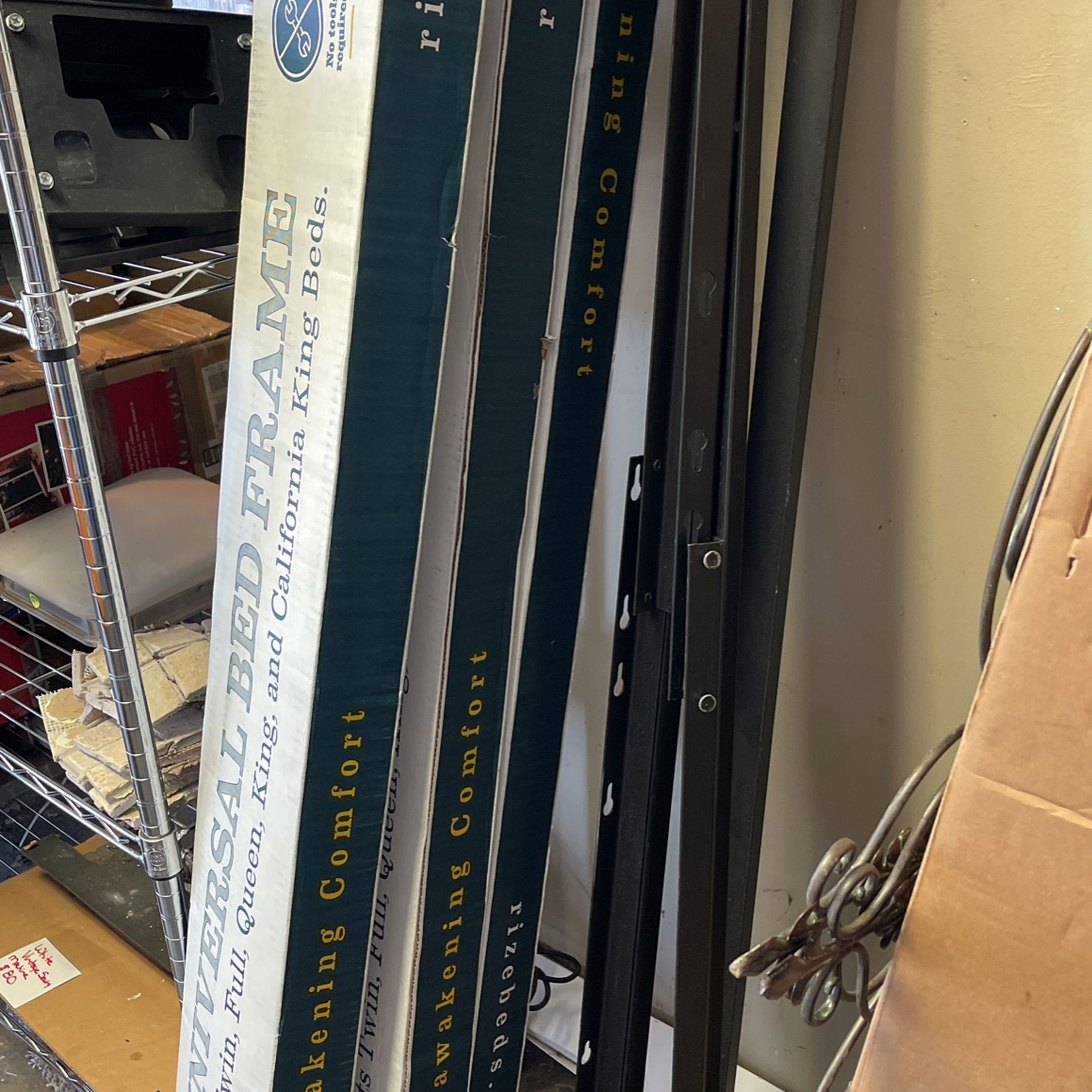 Bed frame fits Twin, Full, Queen, King, and Cali King. Frames are still in the Box. Selling 3 at $45 each. WE ARE CLEARING OUT THE GARAGE & STORAGE UNITS! This is SO GOOD for you! Make an offer!! Note: Shipping costs are NOT included in the price of this/these item(s). ALL items are sold as is and no refunds.