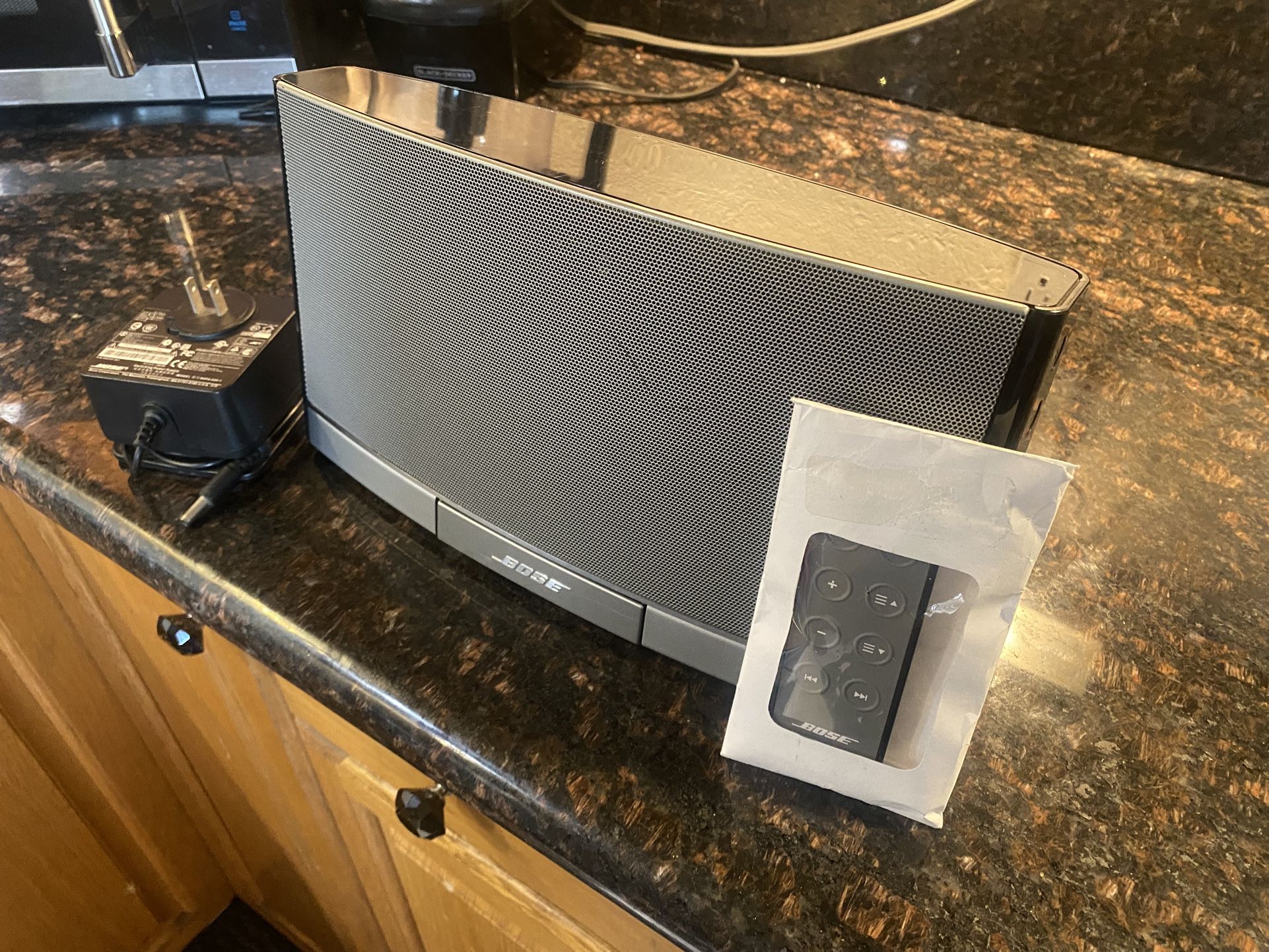 Bluetooth, Apple iPod , Bose charger and long life battery with remote and new battery for the remote control Loudest clearest for it size Has bass port for best bass Slim design for to go packing or storage Ready to go !!! Music downloaded to iPod to start listening immediately, Red Hot chili peppers , Slim Shady Metallica Etc…. Plug-in system all for $100 JBL, Sonos, Sony ,