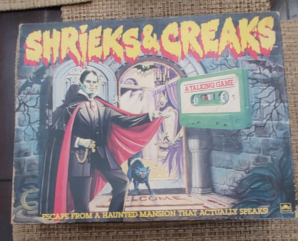 This listing is for a Shrieks & Creaks Talking Horror Board Game. This game was made by the Golden company in 1988 and is in great complete used condition. The box has wear on the corners. Please look at the pictures for further condition and description.