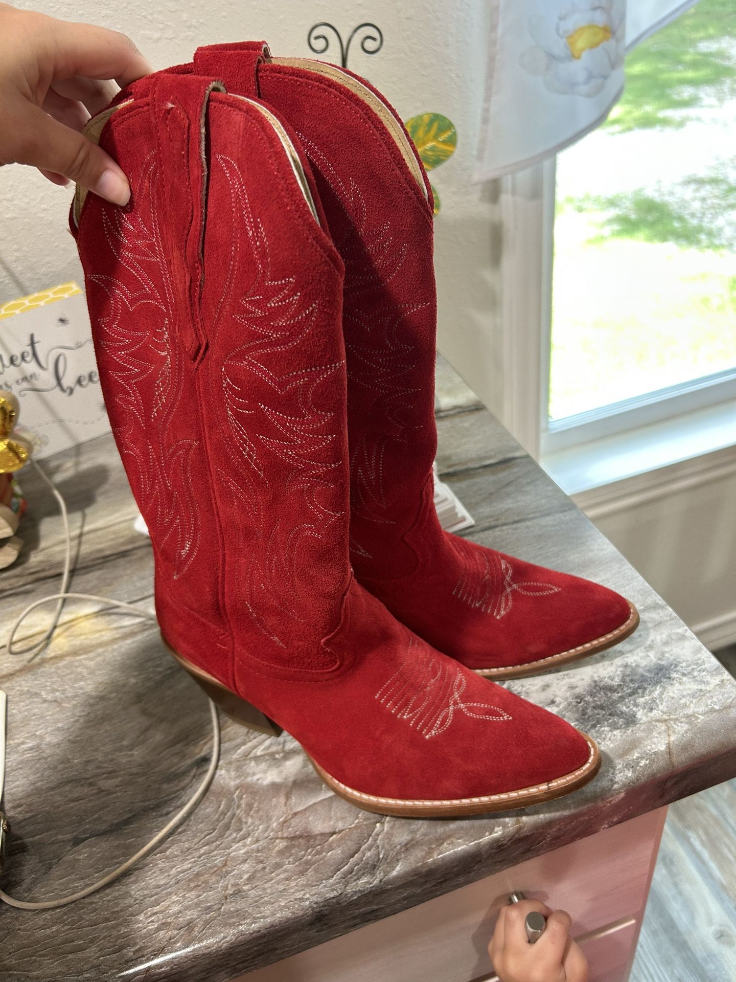 I have these worn once size 9 red suede cowgirl boots. I have no reason to wear them since I’ll never get taken dancing.