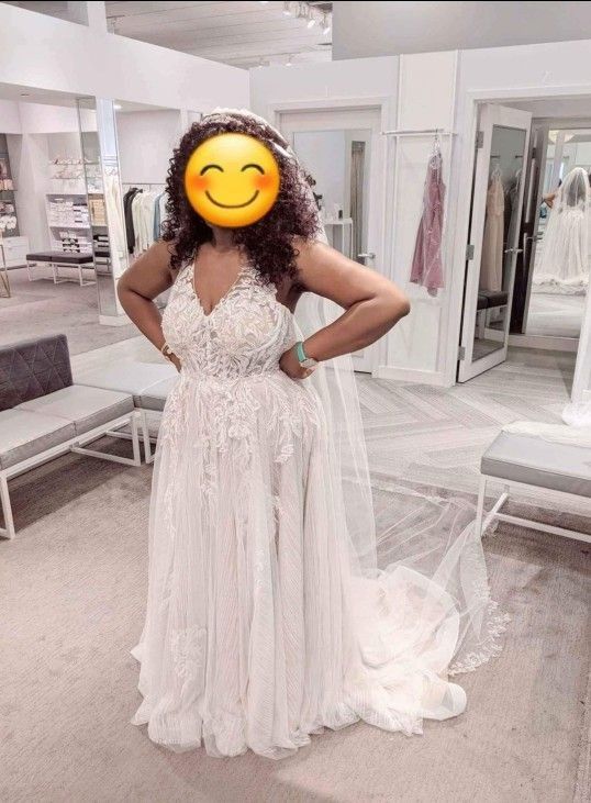 BEAUTIFUL DRESS!!! π€π€π€π€π€ $ BEST OFFER $ Absolutely nothing wrong. NEW - Never worn other than trying on at the boutique. Still in preservation garment bag. π€ WEDDING DRESS DESCRIPTION π€ SIZE 12 | Ivory/Sandstone Perfect for the bride looking to dazzle, this light-catching wedding dress is topped with a halter neckline, a crystal-encrusted corset bodice, and an open back. Sheer floral lace appliques cascade down the pocketed A-line skirt, while dramatic linear glitter shines from beneath. β’ Galina Signature, exclusively at David's Bridal β’ Polyester β’ Side pockets!! β’ Sweep train β’ Back zipper; fully lined β’ Dry clean β’ Imported CURRENTLY $1699 ONLINE π€ VEIL DESCRIPTION π€ 120 in length | Ivory/Sandstone w Metallic and Beaded Trim Delicately embroidered leaves and petals, dotted with pearls and crystals, spill over the edge of this cathedral length veil. β’ Nylon120"L β’ Hang and steam β’ Imported CURRENTLY $199 ONLINE SERIOUS BUYERS ONLY If ad is still up, the dress is still available. Please be ready to pick up at the time of inquiry. Thank you! Location: Elk Grove, 95758 β Near Target Laguna