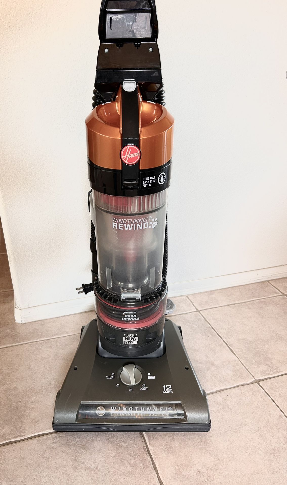 Like new, works great, no issues. Hoover wind Tunnel 2 whole house rewind.. bagless, great for pet, automatic cord rewind, upright powerful deep vacuum cleaner technology. Model: UH70832.