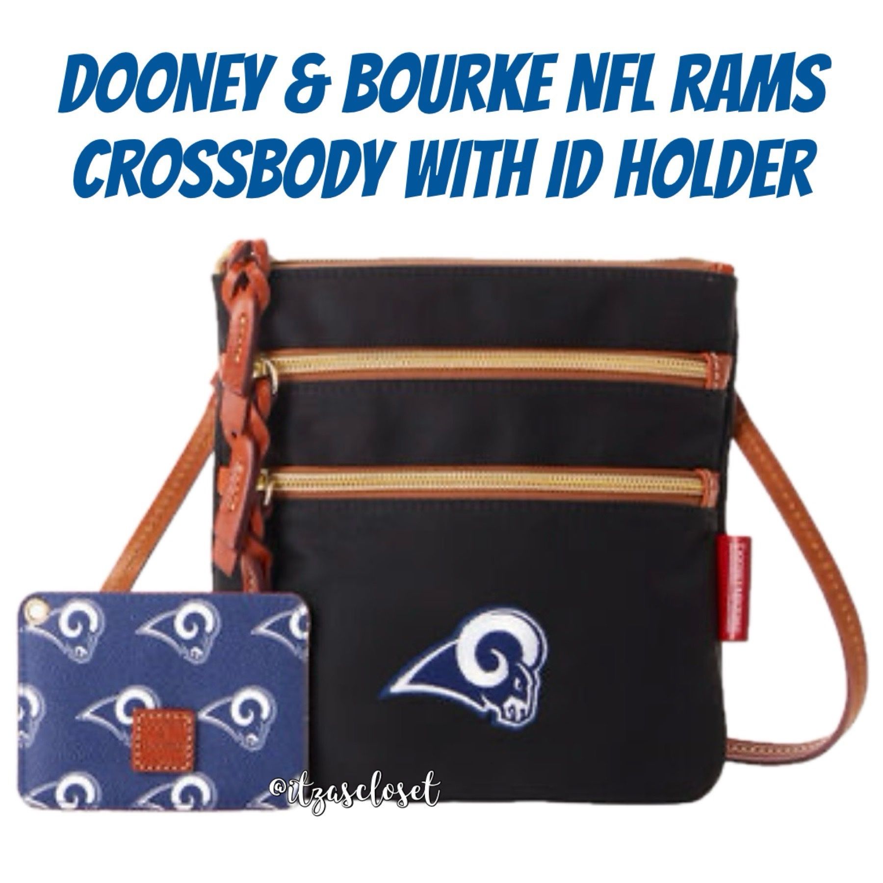 Dooney & Bourke NFL Rams N S Triple Zip Crossbody with ID holder NWT Brand new with tags still attached. Pictures are exact item you will receive. Color: RAMS Style #: BINRM0298BLTN Retail: $168 Zipper closure Adjustable shoulder strap. Strap drop length: 23.75" H 8" x W .5" x L 8" 7 oz Designed in Norwalk, CT by Peter Dooney Two outside zip pockets Lined
