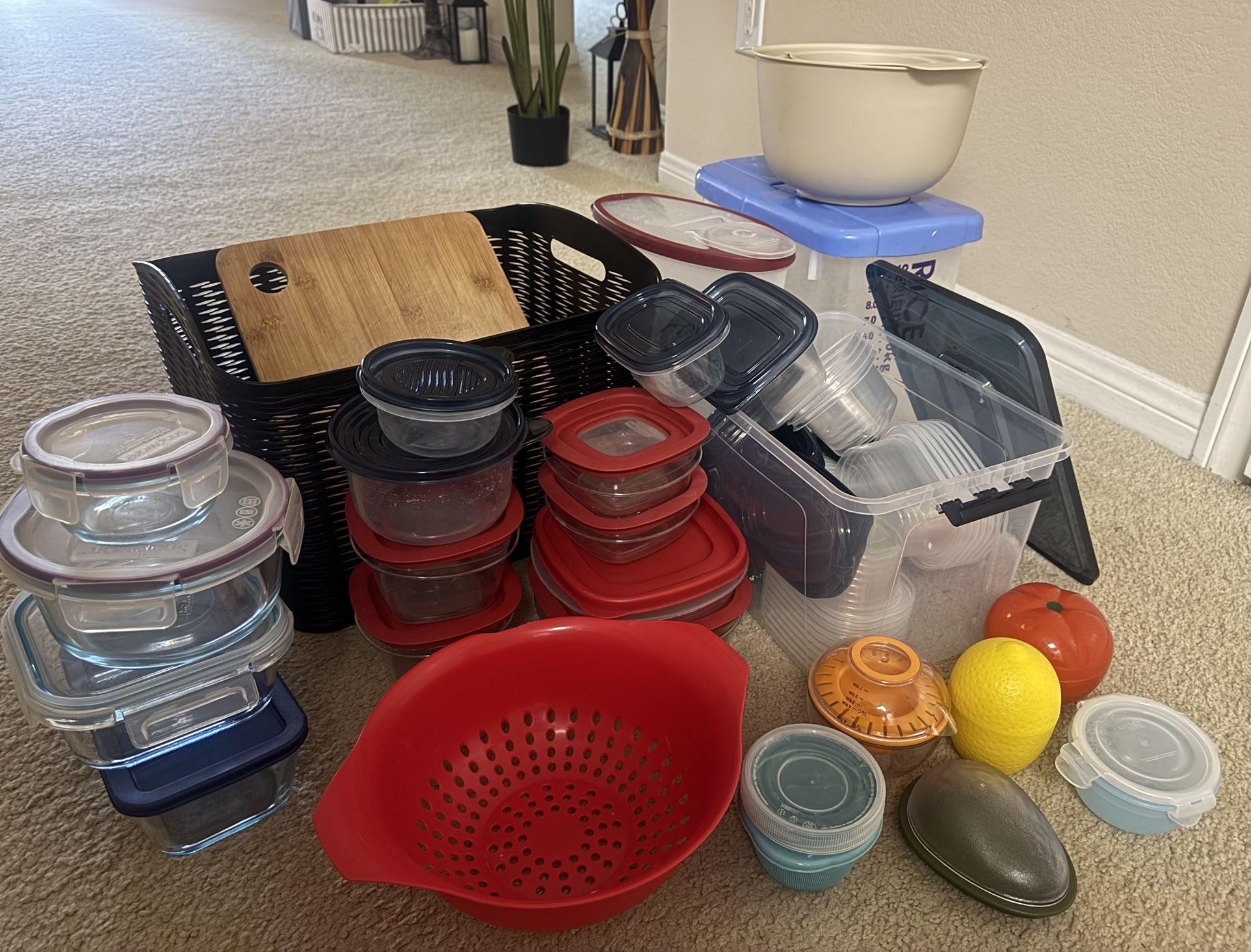 Storage containers/bowls/baskets & wooden chopping board
