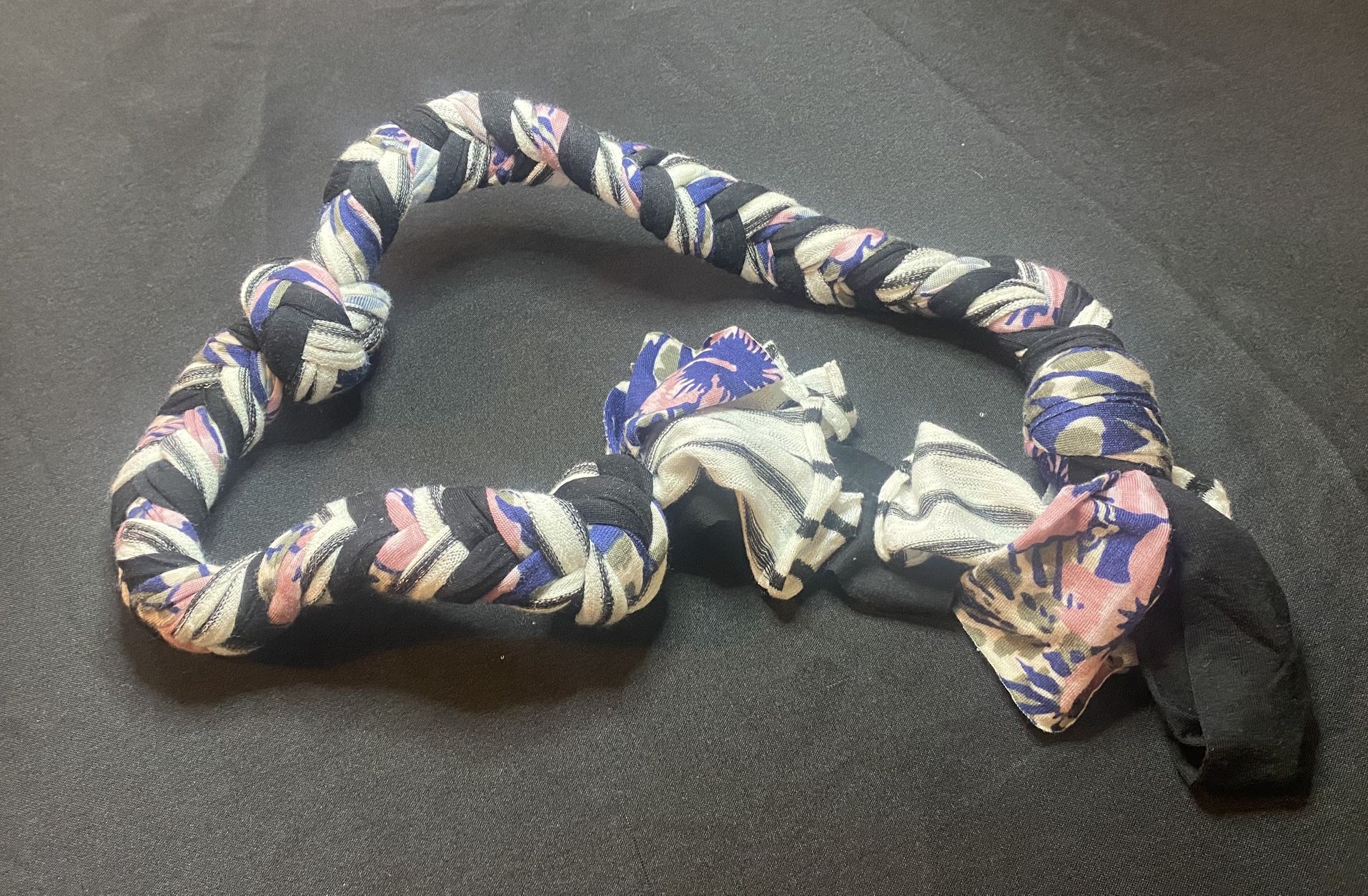 Dog tug toys made from stretchy, pretty fabrics.