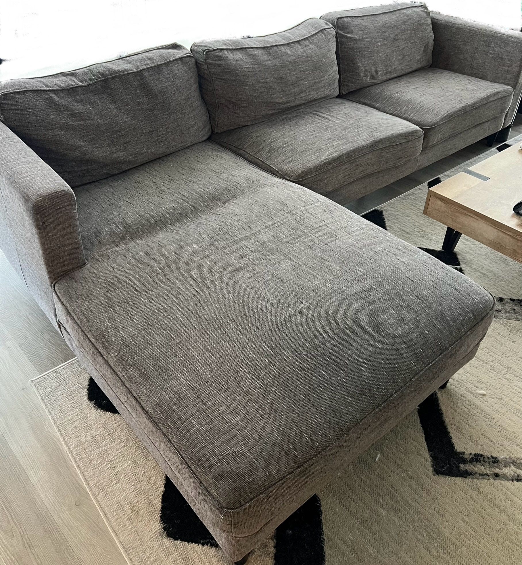 Need gone ASAP by Wednesday April 2nd Originally from Living Spaces Does have a dip in the sectional but still has life in it $70 OBO Measurements: 113"W x 68"D x 35"H Left Facing Chaise