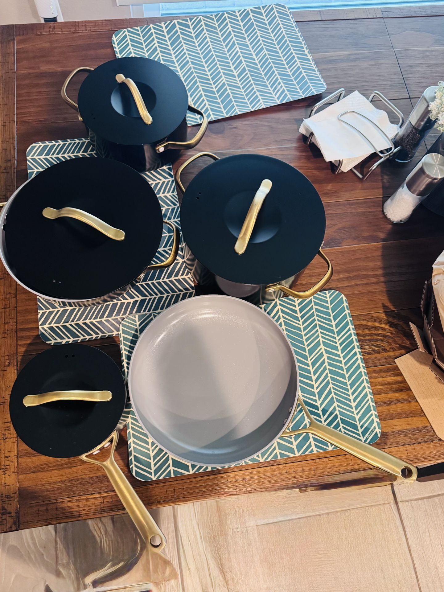 9 pieces Members Mark • Ceramic nonstick interiors • Dual-riveted stainless-steel handles • Heavy-gauge cast aluminum lids lock in moisture and flavor • Suitable for all cooktops, including induction • Oven-safe up to 450°F (232°C)